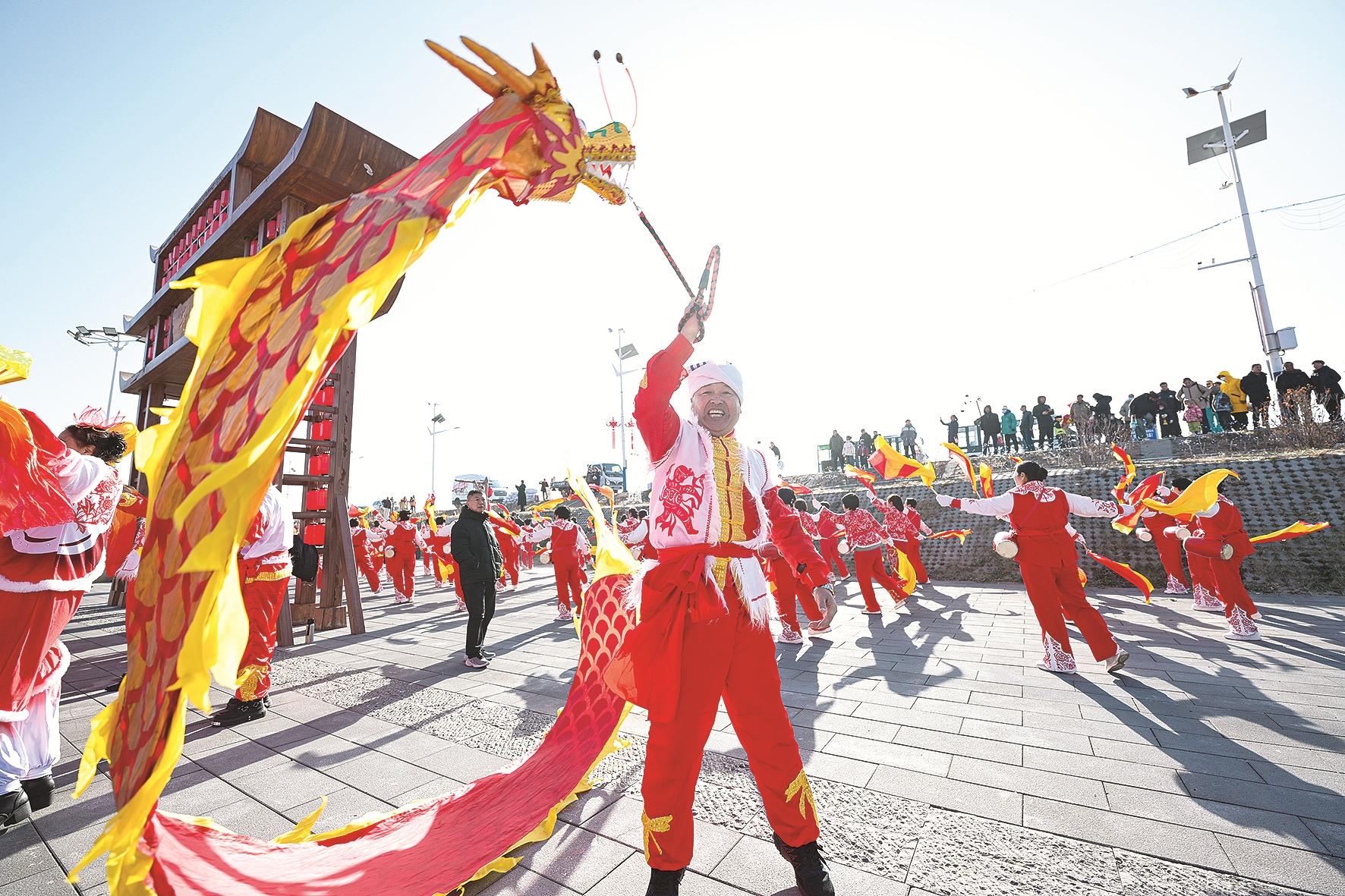 12月6日,“天下黄河第一村”迎来包头黄河观凌季,游人如织。河面之上,晶莹凌块随波涌动、碰撞作响,绘就冬日壮阔图景。岸边锣鼓铿锵,欢快的秧歌,翻飞腾跃的龙形空竹,民俗表演精彩纷呈。游客们赏流凌盛景、品特色美食,在传统文化与自然奇观的交融中,尽享欢乐周末时光。丰富多彩的民俗节目悦动黄河岸。记者 李强 摄