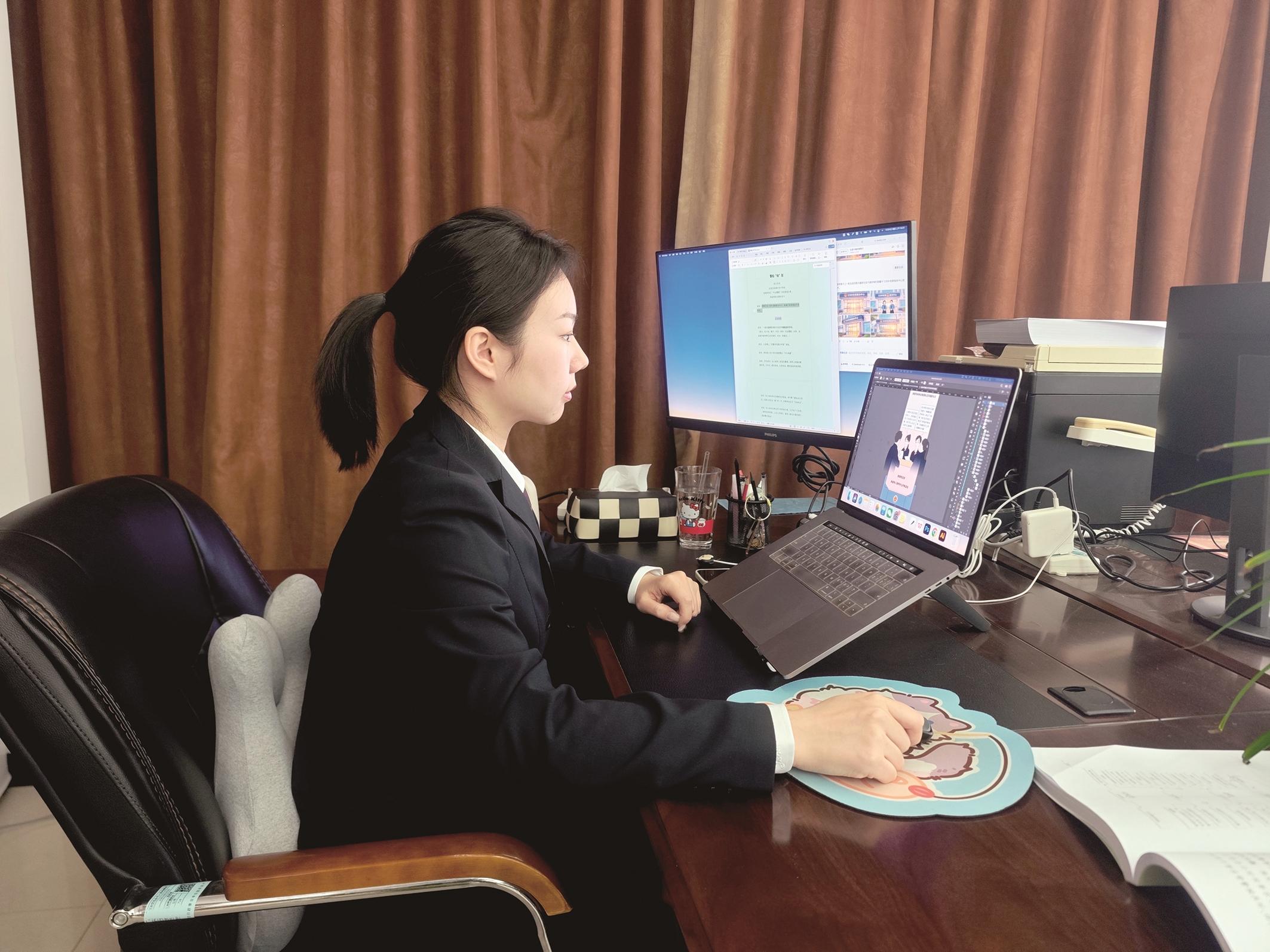 “最初就是想打破‘法条难懂、普法枯燥’的刻板印象,让法治知识走进普通人的手机里、生活中。”采访中,市检察院新媒体创作团队成员之一赵一多坐在办公桌前,手里描摹着绘板向记者演示,“画人物的时候,得先勾勒眼黑、补充眼白,复制后调整角度,再添上鼻子和表情,一个鲜活的角色就有了雏形。”赵一多介绍,核心角色“包包”是活泼灵动的女性检察官,负责串联剧情、拉近距离;“小检”则是专业严谨的男性检察官,专攻法条解读、答疑解惑,这对“普法搭档”从去年“酒驾新规”相关普法内容开始亮相,如今已成为“包检微课堂”的标志性形象。