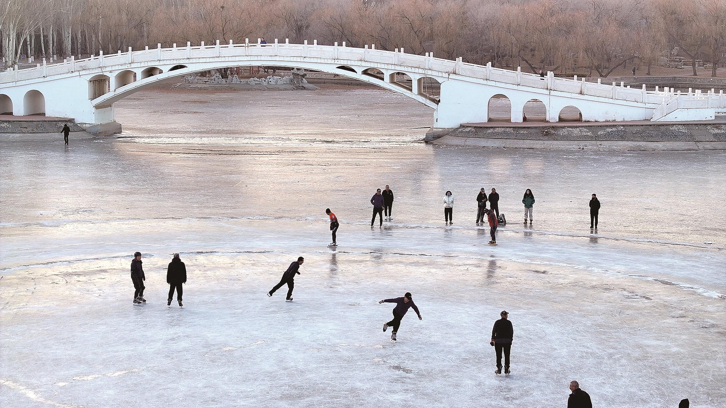 当落日的余晖为冰封的湖面铺上暖金色的滤镜时,包头劳动公园的冰场便成了市民的“露天健身房”——白色拱桥下,冰刀划过冰面的声音与欢笑交织,有人弓步滑行练平衡,有人舒展肢体练柔韧,还有人组队追逐,在冰上完成一场“速度与耐力”的趣味较量。冰场让“冬藏”变成了“冬练”,市民在寒冷的冬日里充满活力。记者 祝家乐 摄