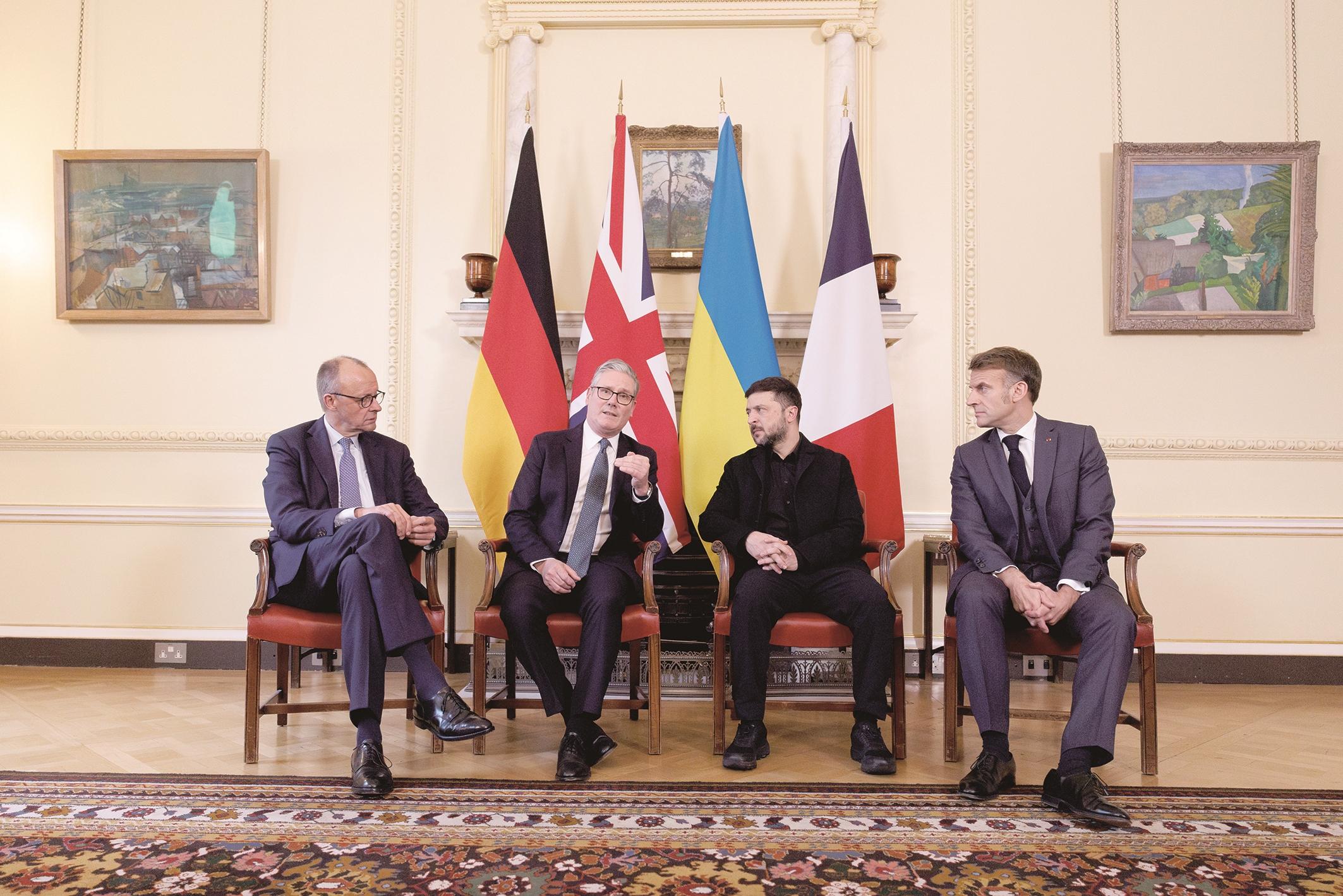 12月8日,在英国伦敦唐宁街10号首相府,英国首相斯塔默(左二)、法国总统马克龙(右一)、德国总理默茨(左一)与乌克兰总统泽连斯基举行会谈。新华社发(英国首相府供图)