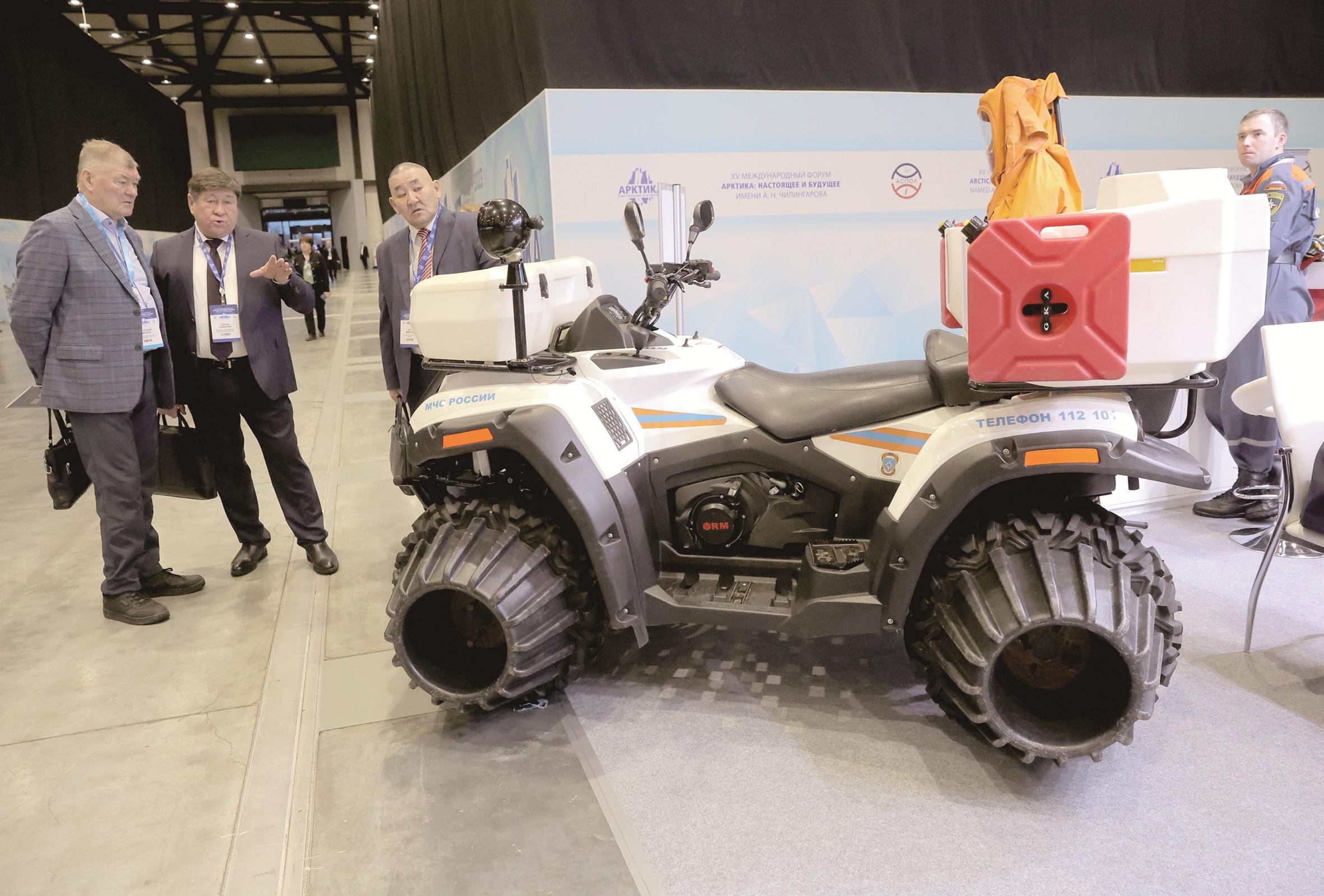 12月9日,在俄罗斯圣彼得堡,第十五届“北极:现状和未来”国际论坛展览会上展出一辆雪地摩托。