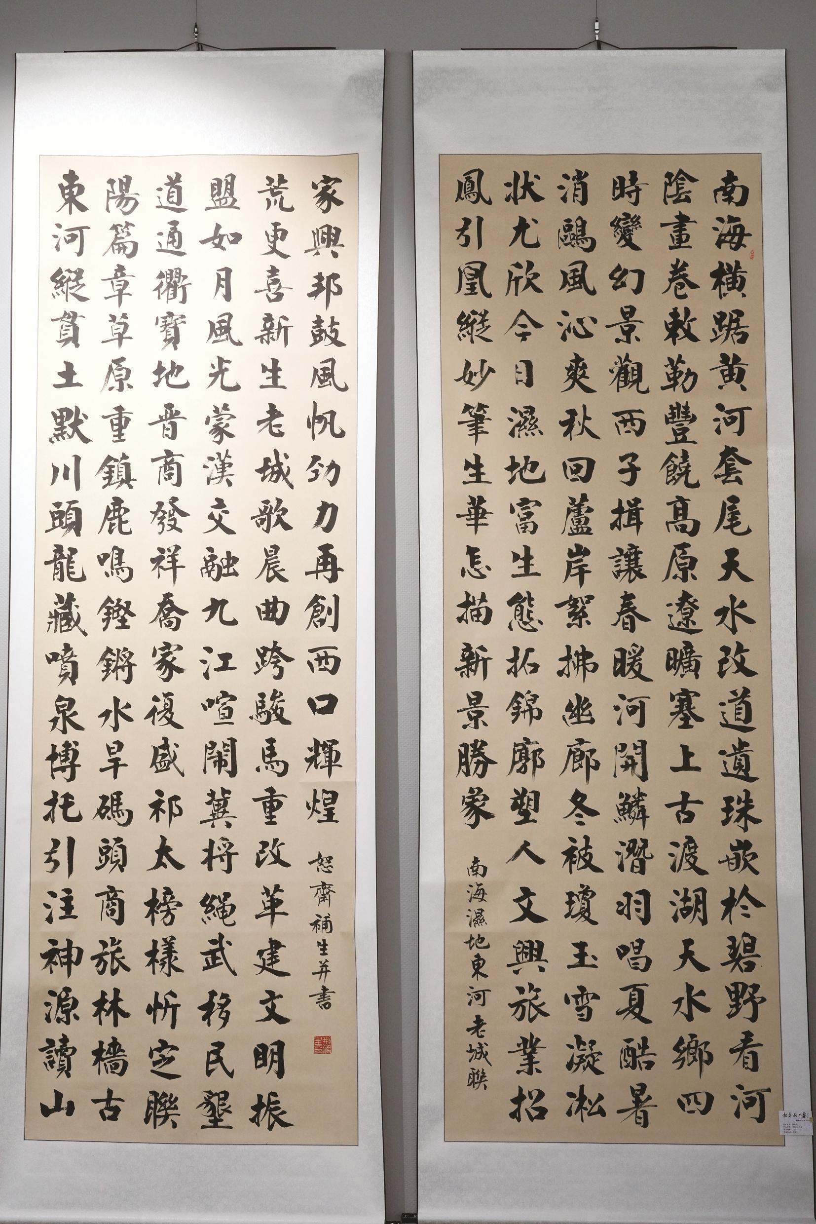 十公者:刘公文谦、刘公文奇、王公德恭、马公沛成、张公东生、王公小雷、邢公补生、李公贺忠、孙公云生、刘公恒军诸贤也,皆久寓是邦,情系斯土。或主坛坫,广结墨缘;或执教鞭,长育菁莪;或潜心书理,探赜钩玄;或专务翰墨,自出机杼。诸艺兼通,各树一帜。其雄浑者若大漠孤烟,清雅者如草原初月,古朴者类秦砖汉瓦,潇洒者似秋隼盘空。年齿自八旬有二至六旬有五,而笔力皆健,精神弥彰。昔右军有云:“把笔抵锋,肇乎本性。”观诸公之作,信然矣。盖其笔墨,非仅各自平生之写照,实为彼此情谊之见证。名以“相看两不厌”者,拟于老友之重逢,契阔谈?;亦喻人书之相得,浑然忘机。铁划银钩,蕴寒暑之砥砺;浓淡枯润,涵世事之沧桑。髫龄梦浅,尚漫烂于墨痕;故土情深,长氤氲于纸背。