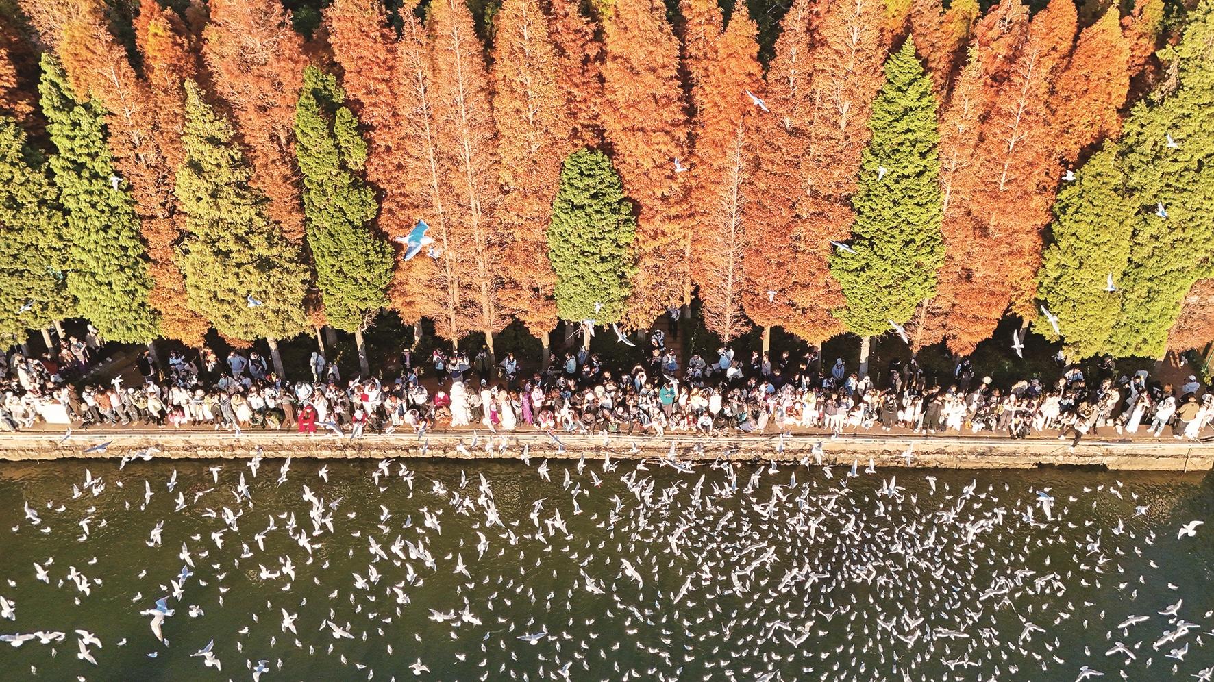 12月10日,游客在滇池畔的海洪湿地公园喂红嘴鸥(无人机照片)。