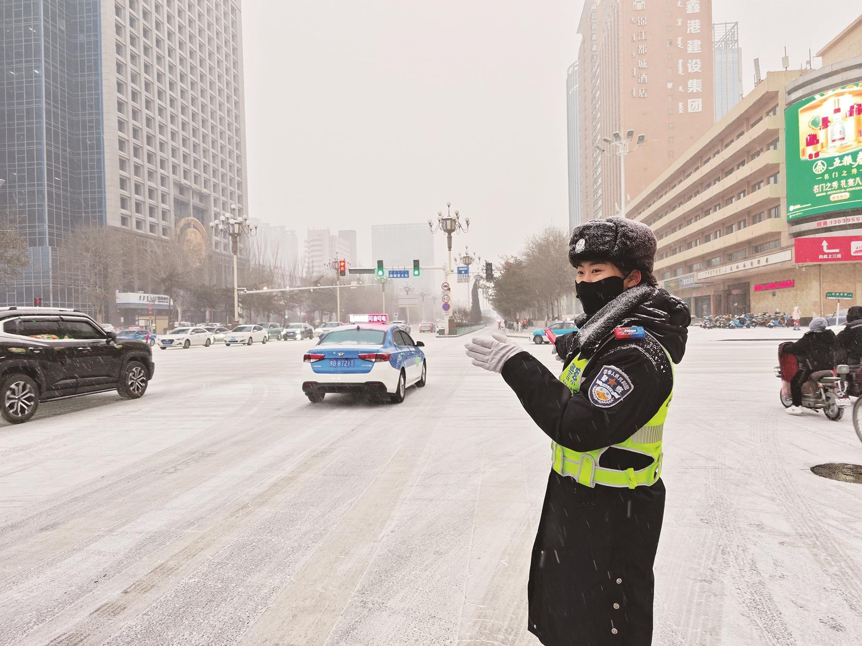风雪中包头交警全力保障出行安全顺畅。通讯员 王雪茹 摄