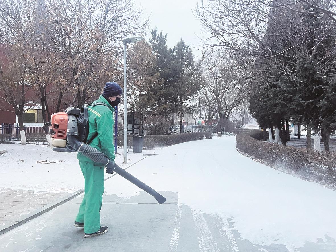 ↑12日清晨,包头乐园工作人员清理积雪,保障游人安全。记者 李强 摄