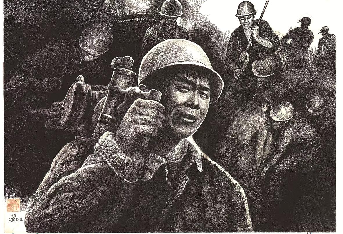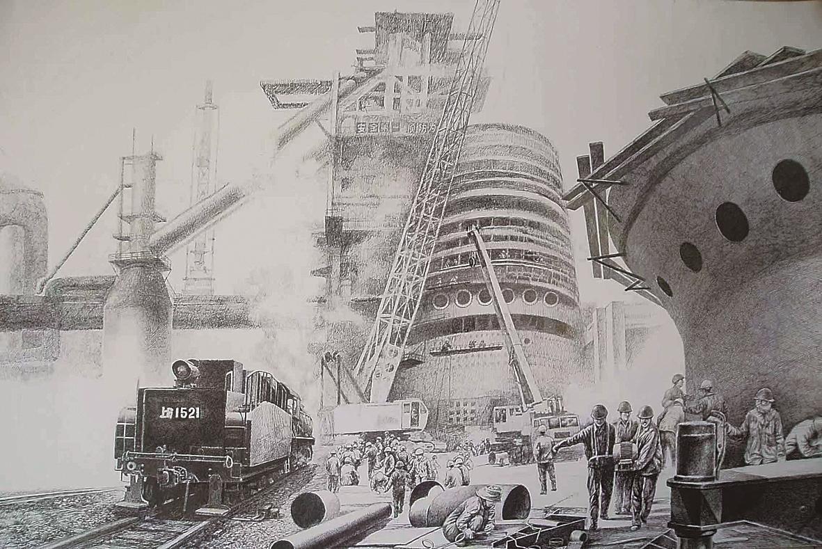 他的画作中,《高炉建设》透着沉甸甸的工业质感,黝黑的炉身布满垂直的钢构纹路,劳作的工人身影交错:有人弯腰扛着钢筋,有人仰头调整设备,臂膀的肌肉线条,安全帽的弧线、工装的褶皱,甚至手套上的磨损痕迹,都用细密的短线刻画得淋漓尽致。每一笔都带着温度,把建设者的热血与坚韧,把工业崛起的磅礴力量,牢牢地凝在纸上。