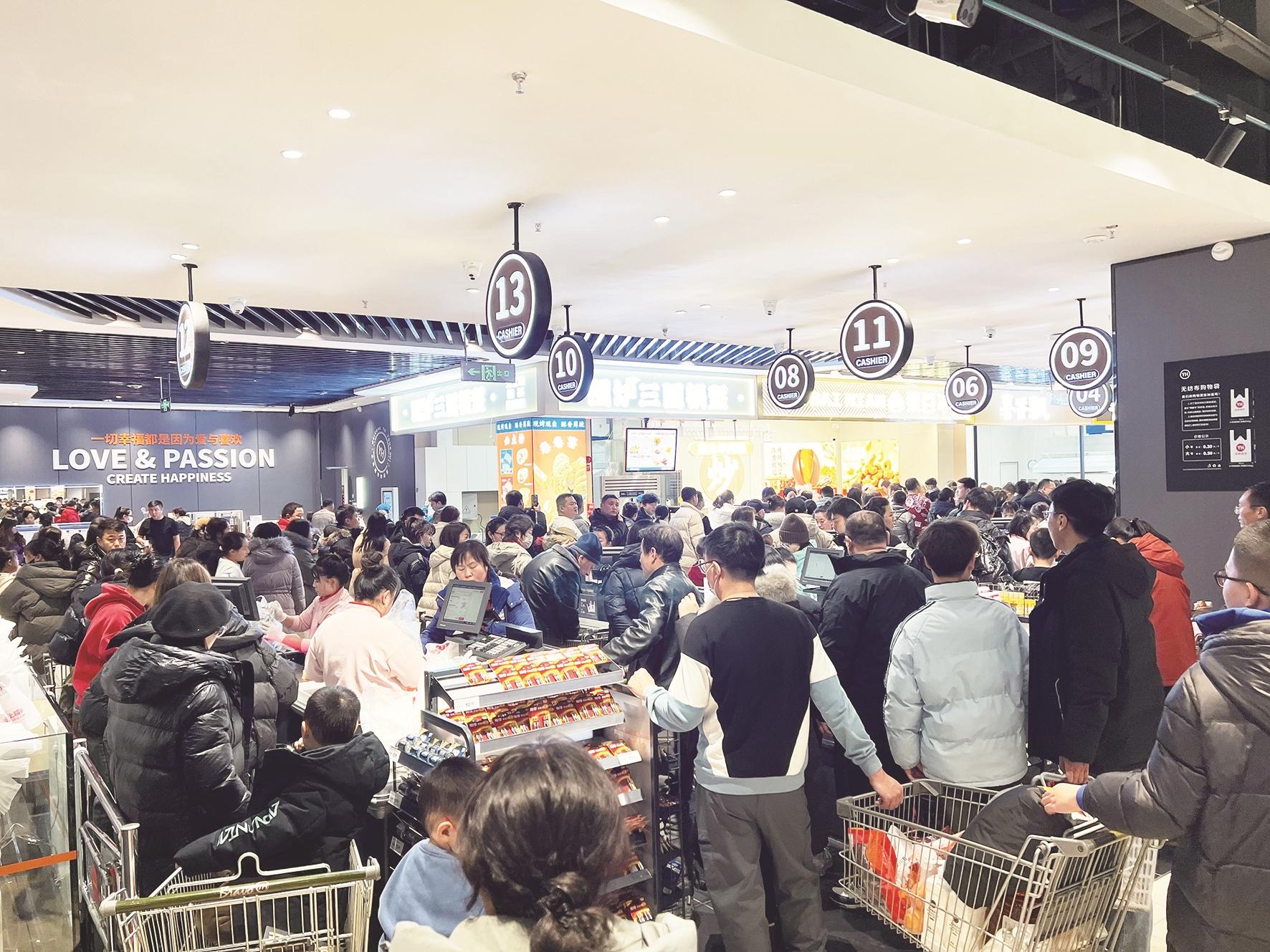 12月13日,记者在昆区吾悦广场永辉超市看到,该超市人头攒动,客流爆满,在超市外甚至排起了长龙。据了解,该超市学习胖东来自主调改后开业,吸引了众多消费者慕名而来。热闹的消费场景,展现出消费市场的旺盛活力,也折射出百姓对商品品质和服务需求的不断提高。 记者 李强 摄