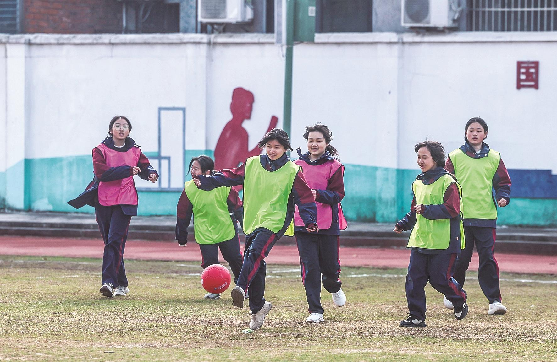12月16日,轧村中学的学生们在阳光大课间活动中参加足球游戏。