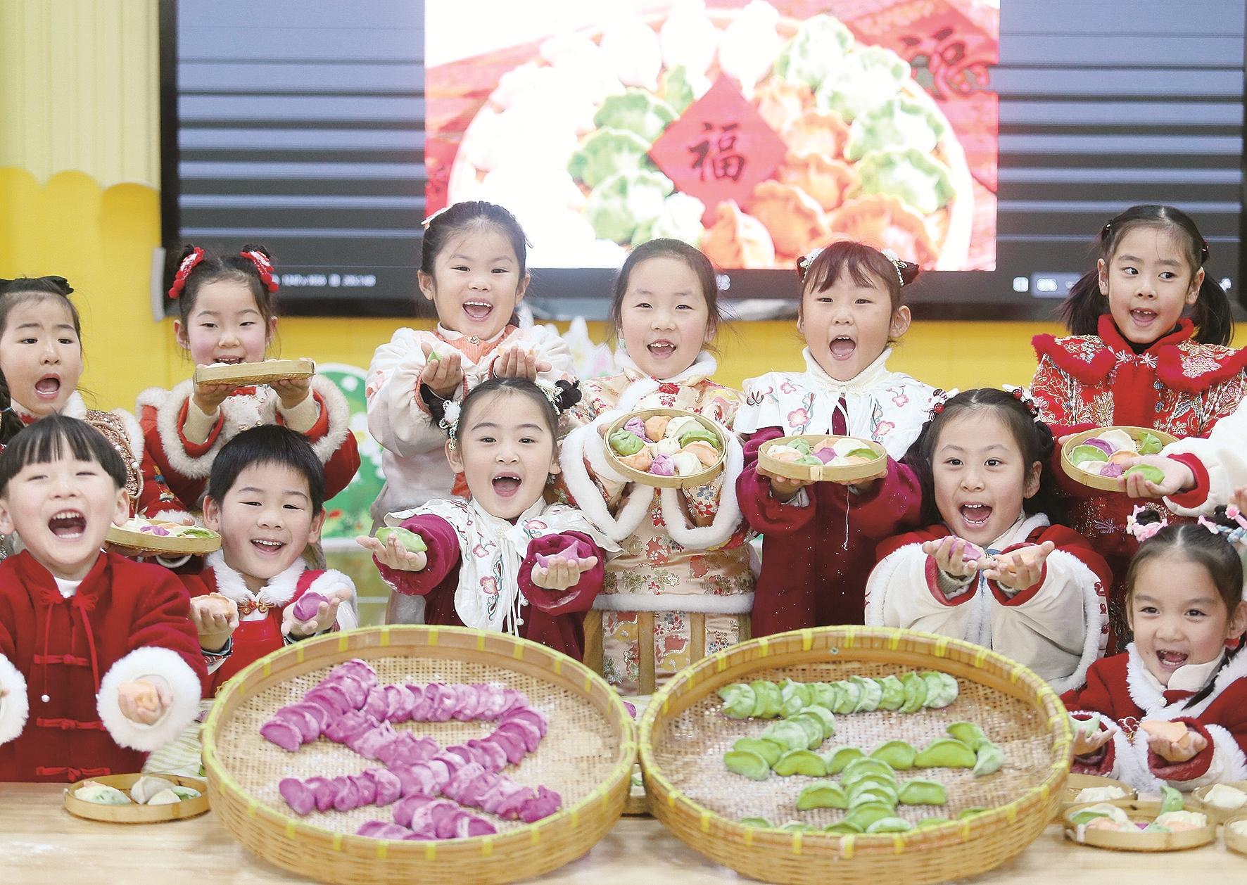 12月18日,江苏省扬州市九龙花园社区一家幼儿园的小朋友展示包好的饺子。