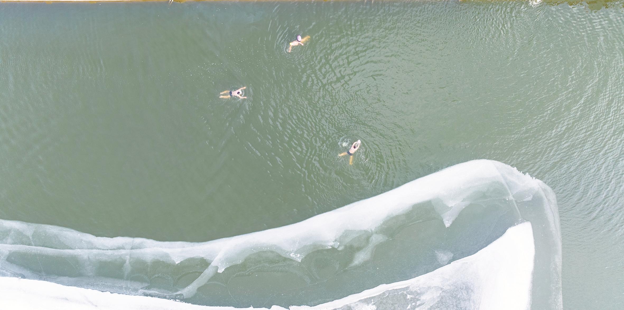 12月19日,午后阳光下的昆河更显壮阔。碧水蜿蜒于皑皑白冰间,冬泳爱好者挑战自我,以勇气对抗严寒,纵身跃入水中,在寒波里舒展身躯,畅快游泳。记者 李强 摄