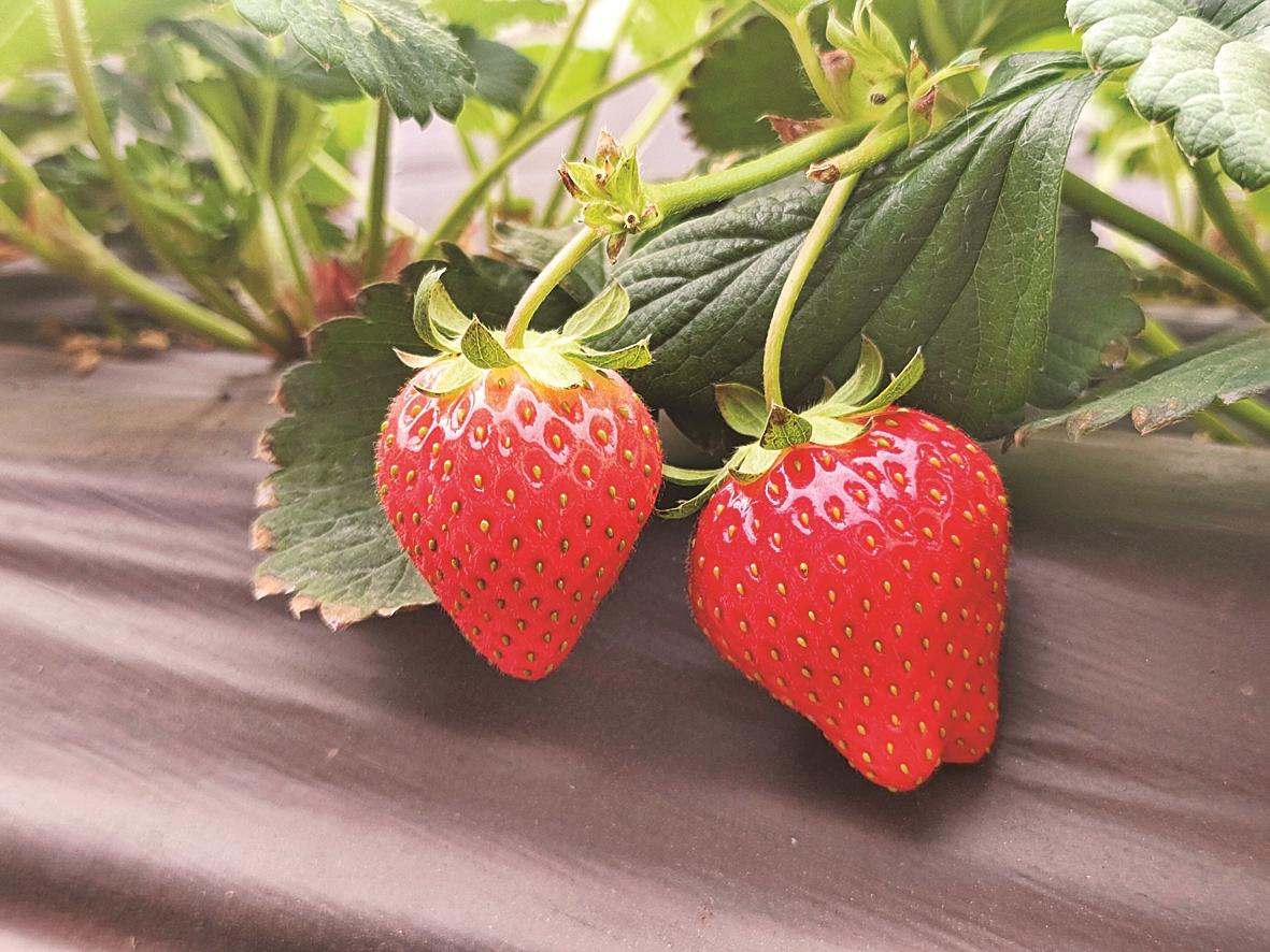 本报讯 日前,记者走进青山区青福镇色气湾村的草莓大棚,暖意瞬间裹住全身——20多度的棚内,湿润的空气里飘着浓郁的清甜果香;一垄垄翠绿的草莓藤上,红彤彤的果实挂在藤蔓间,有的裹着细白绒毛,有的红得发亮,与棚外的冰天雪地形成鲜明反差,冬日里的“甜蜜暴击”就在这里上线。