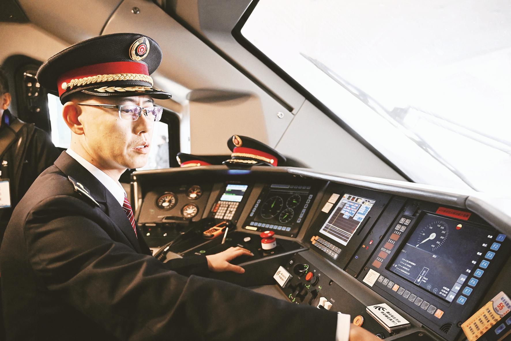 此后,草原列车迭代升级,李宁的成长脚步也随之不断前进。2009年,呼铁局引入电力机车,他成为首批转型钻研新机型的司机;2013年,城际特快列车开通,他成为160公里时速线路的主力司机;2017年,京包客专联调联试,他奔赴沈阳深造复兴号驾驶技能。从内燃机车到电力机车,从普速列车到高速动车组,十几年间,李宁先后驾驭9种机型,累计安全行车1300多趟近千万公里,摸索总结的平稳操纵法,具有冲动小、精度高等优点,并在草原高铁司机中推广使用,创下对标停车“零误差”的纪录。
