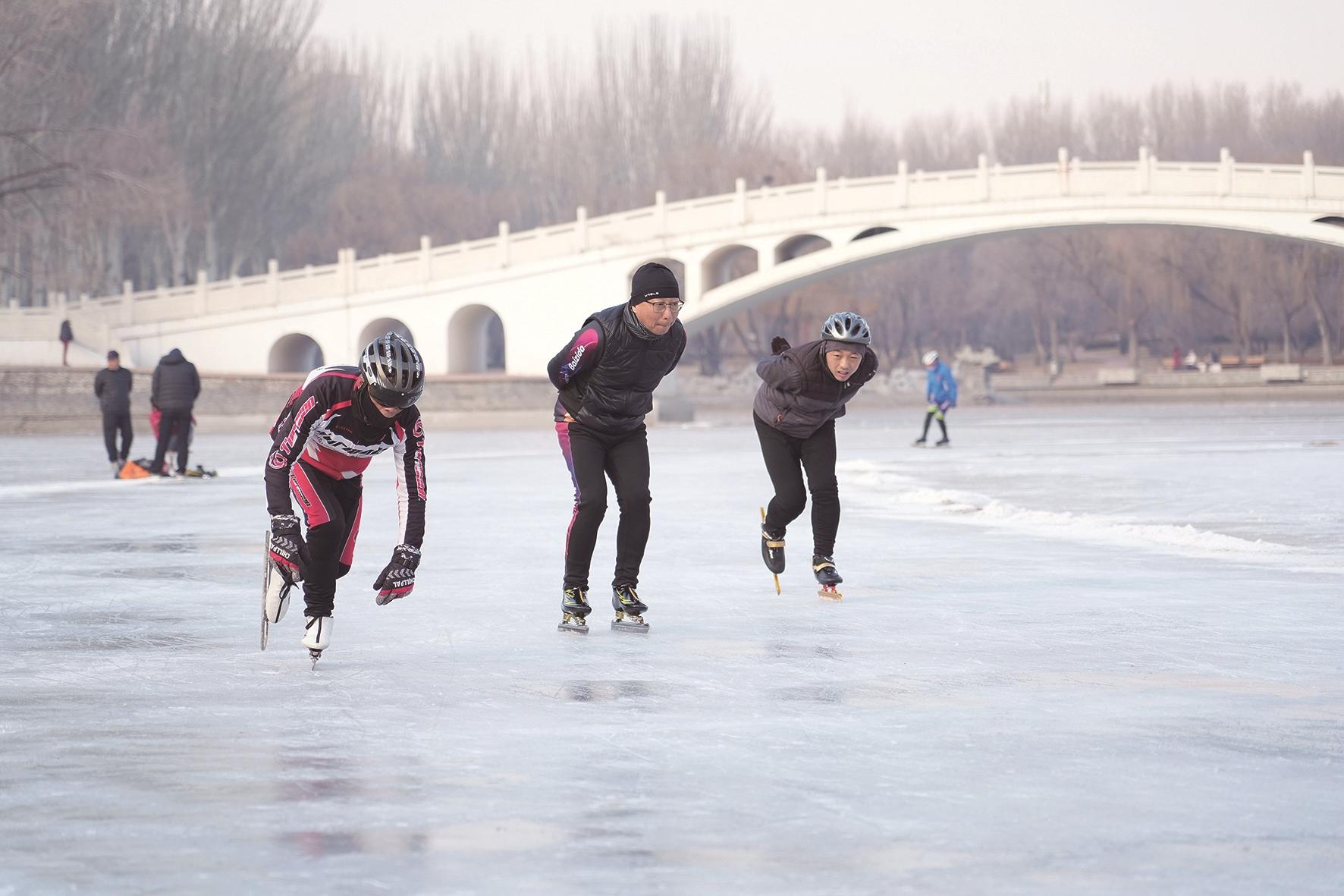 当寒风为劳动公园湖面披上银装,往日碧波化作天然冰场,成了冬日里最热闹的舞台。冰面上,速滑达人脚踩冰刀如飞燕掠水,划出流畅弧线。