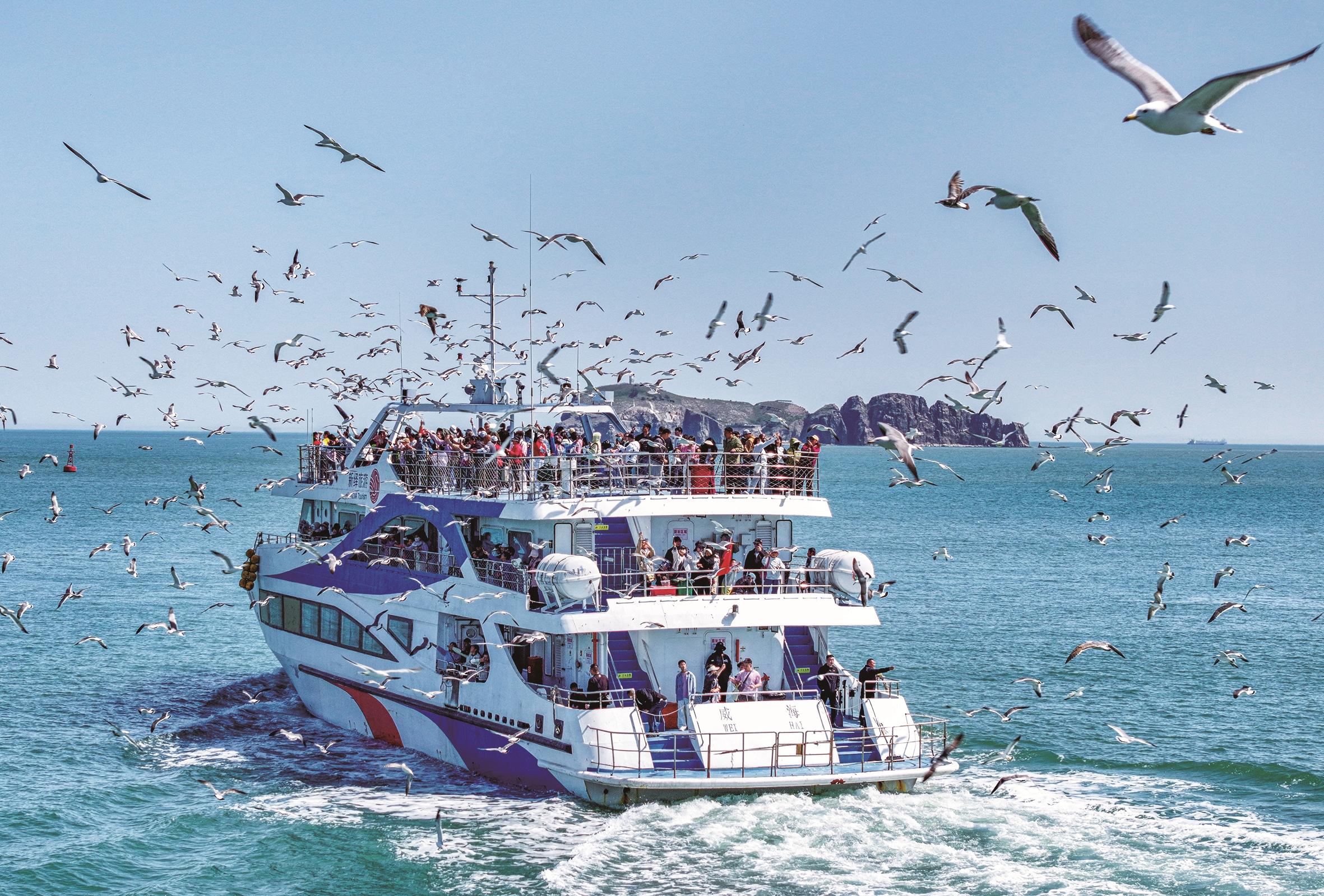 2025年5月4日,在山东省荣成市海驴岛海域,游客乘坐海驴岛环岛游专线与黑尾鸥互动(无人机照片)。