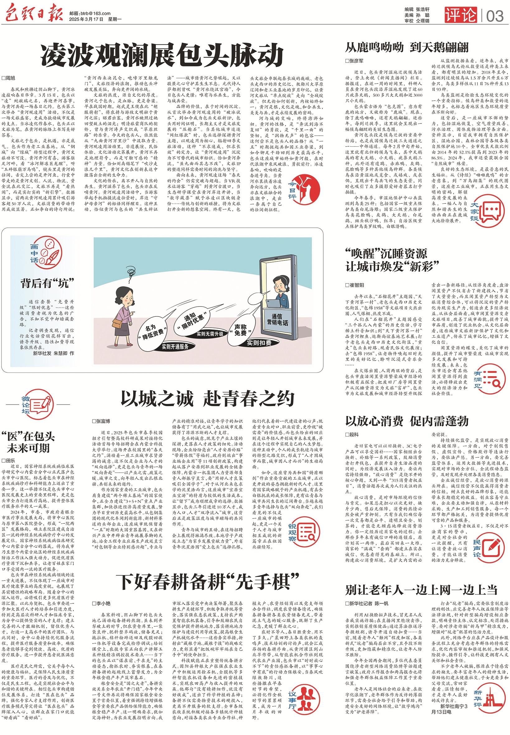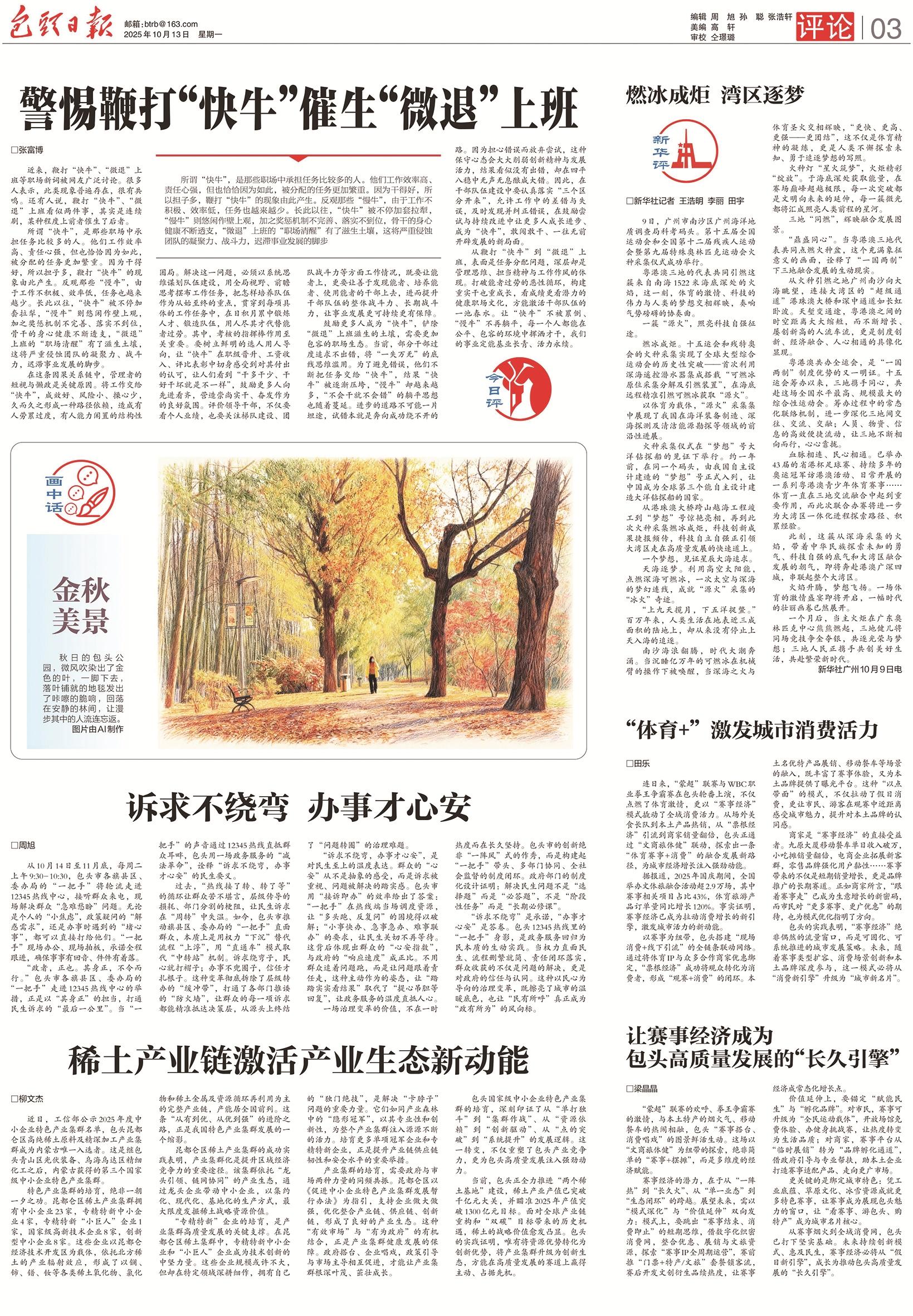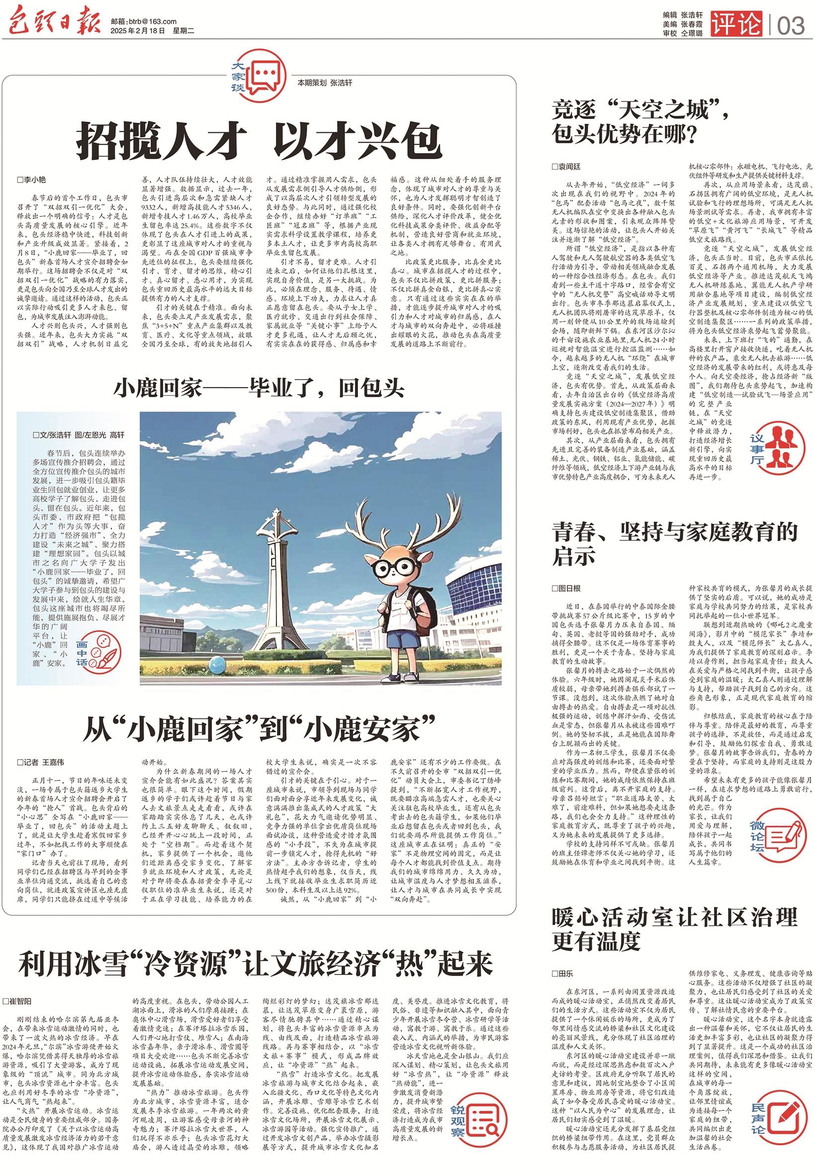 2025年,包头日报开设评论版,聚焦包头市产业发展、城市更新、民生关切和文旅亮点等热点话题,与广大读者共话包头的变化。从家门口的充电桩安装到老旧小区更新改造、从闲置资产盘活到全国赛事举办、从“一元钱”服务到“一把手”走进12345热线中心……2025年的包头,既有暖到心田的城市微光,也有激昂奋进的发展动能。岁末年初,包头日报特精选评论11篇,从多个角度与您一同回顾不平凡的2025。