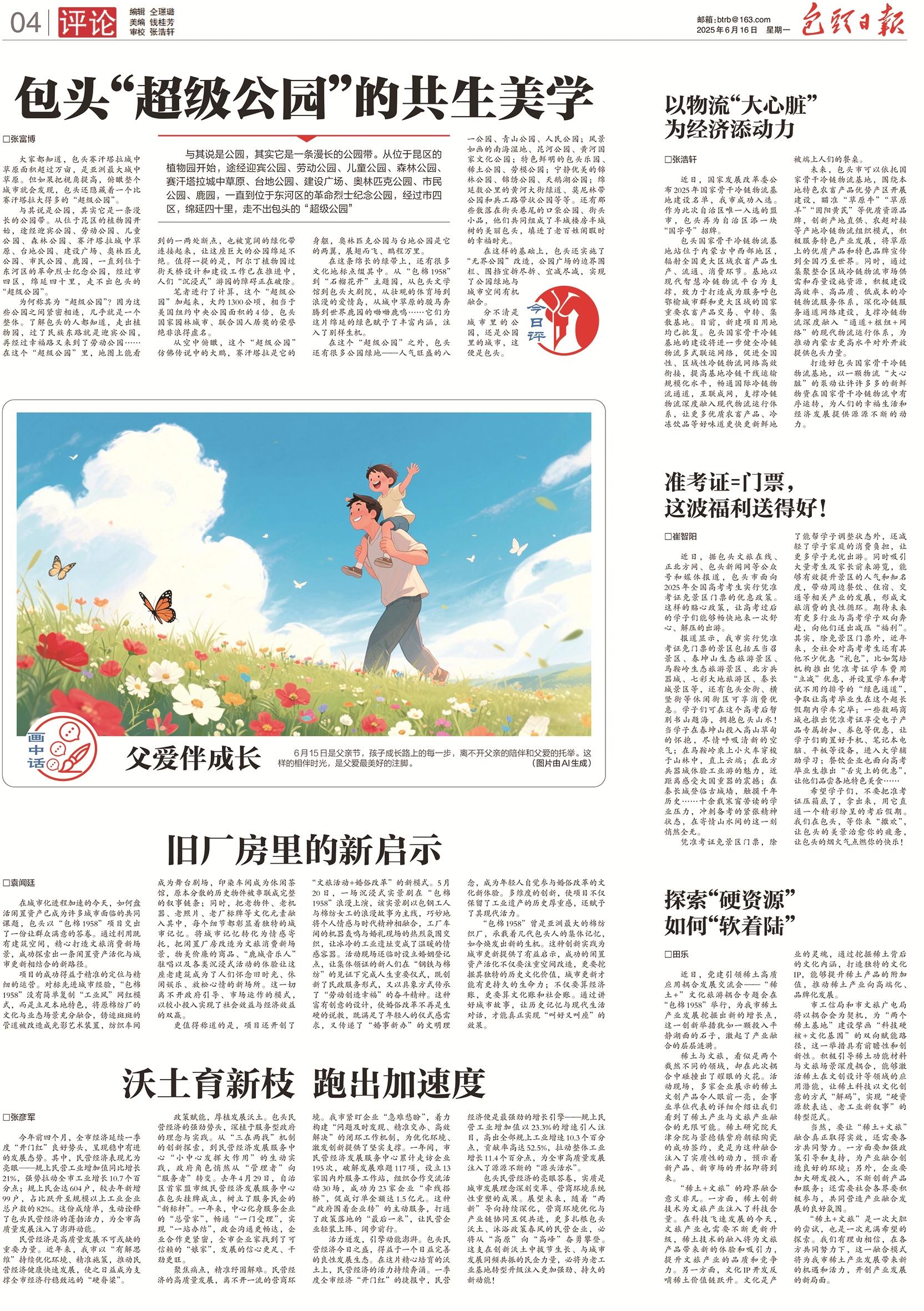 这座公园的独特之处在于“无界”与“共生”。通过拆除围栏,公园与城市街道有机融合,形成“半城楼房半城树”的格局。绿色之中,更穿插着“包棉1958”、大剧院、爱情岛等人文景观,自然生态与城市记忆在此交织,为绵延的绿色注入了丰富内涵与别样生机。这不仅是生态建设的成就,更是城市发展理念的体现。它让公园不再是城市的点缀,而是与城市空间呼吸与共的有机整体。在这里,人们已分不清是城在园中,还是园在城里——这份浑然一体的共生之美,正是包头美好人居环境的生动诠释。(2025年6月16日 4版)