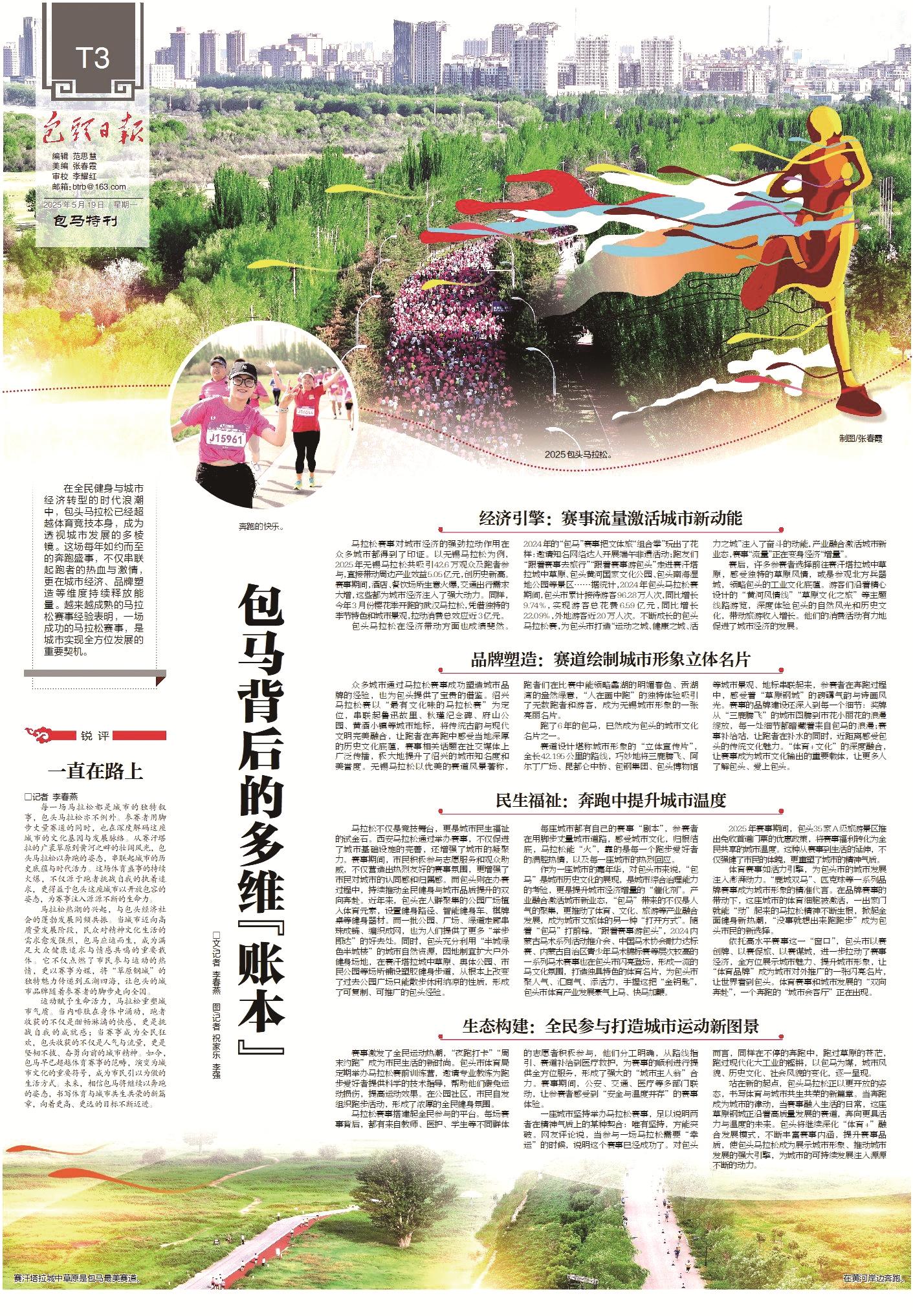 包头马拉松超越体育竞技本身,成为透视城市发展的多棱镜。这场每年如约而至的奔跑盛事,不仅串联起跑者的热血与激情,更在城市经济、品牌塑造等维度持续释放能量。越来越成熟的马拉松赛事经验表明,一场成功的马拉松赛事,是城市实现全方位发展的重要契机。《包马特刊》5月19日T3版