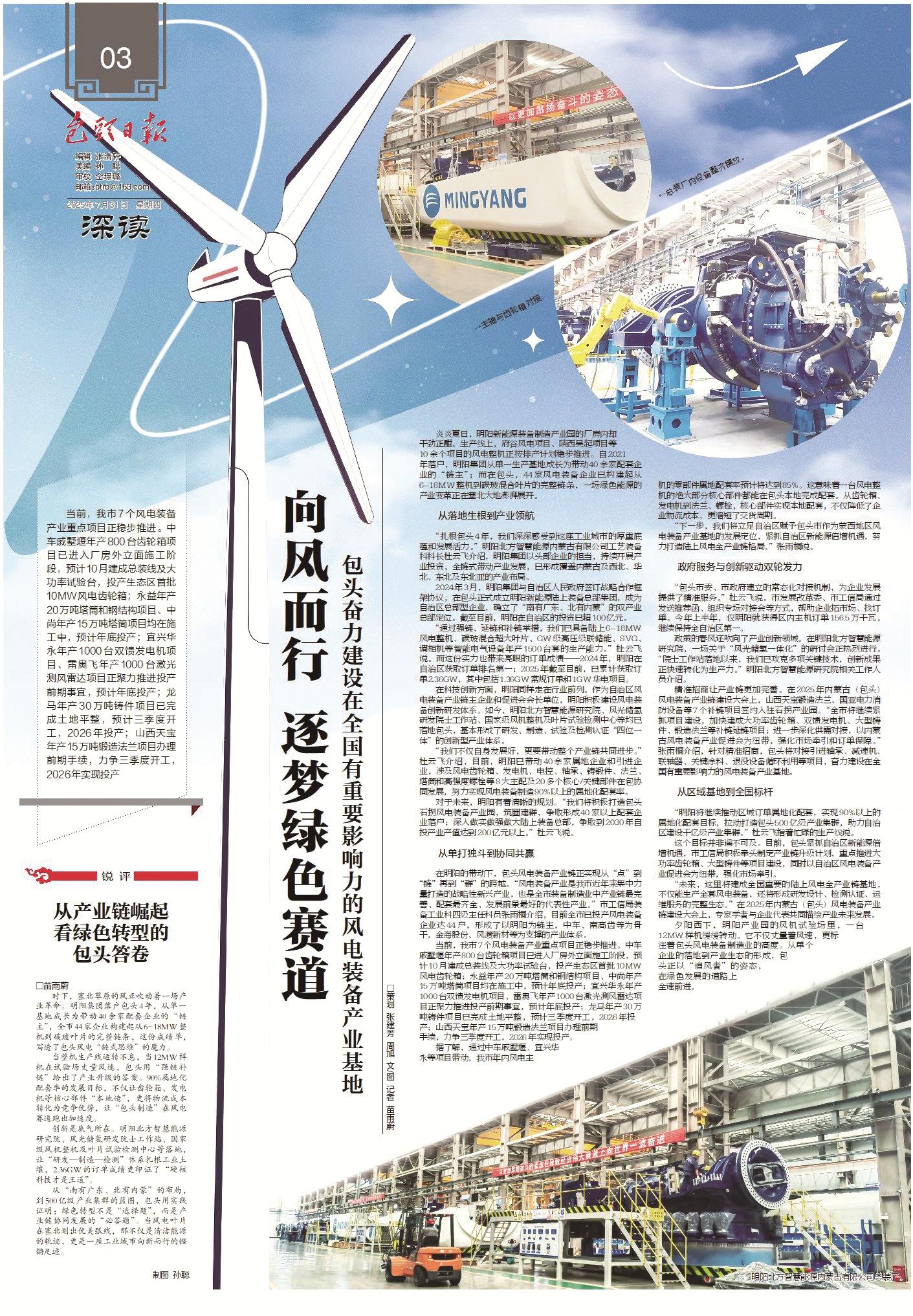 炎炎夏日,明阳新能源装备制造产业园的厂房内却干劲正酣。生产线上,府谷风电项目、陕西吴起项目等10余个项目的风电整机正按排产计划稳步推进。自2021年落户,明阳集团从单一生产基地成长为带动40余家配套企业的“链主”;而在包头,44家风电装备企业已构建起从6-18MW整机到碳玻混合叶片的完整链条,一场绿色能源的产业变革正在塞北大地澎湃展开。