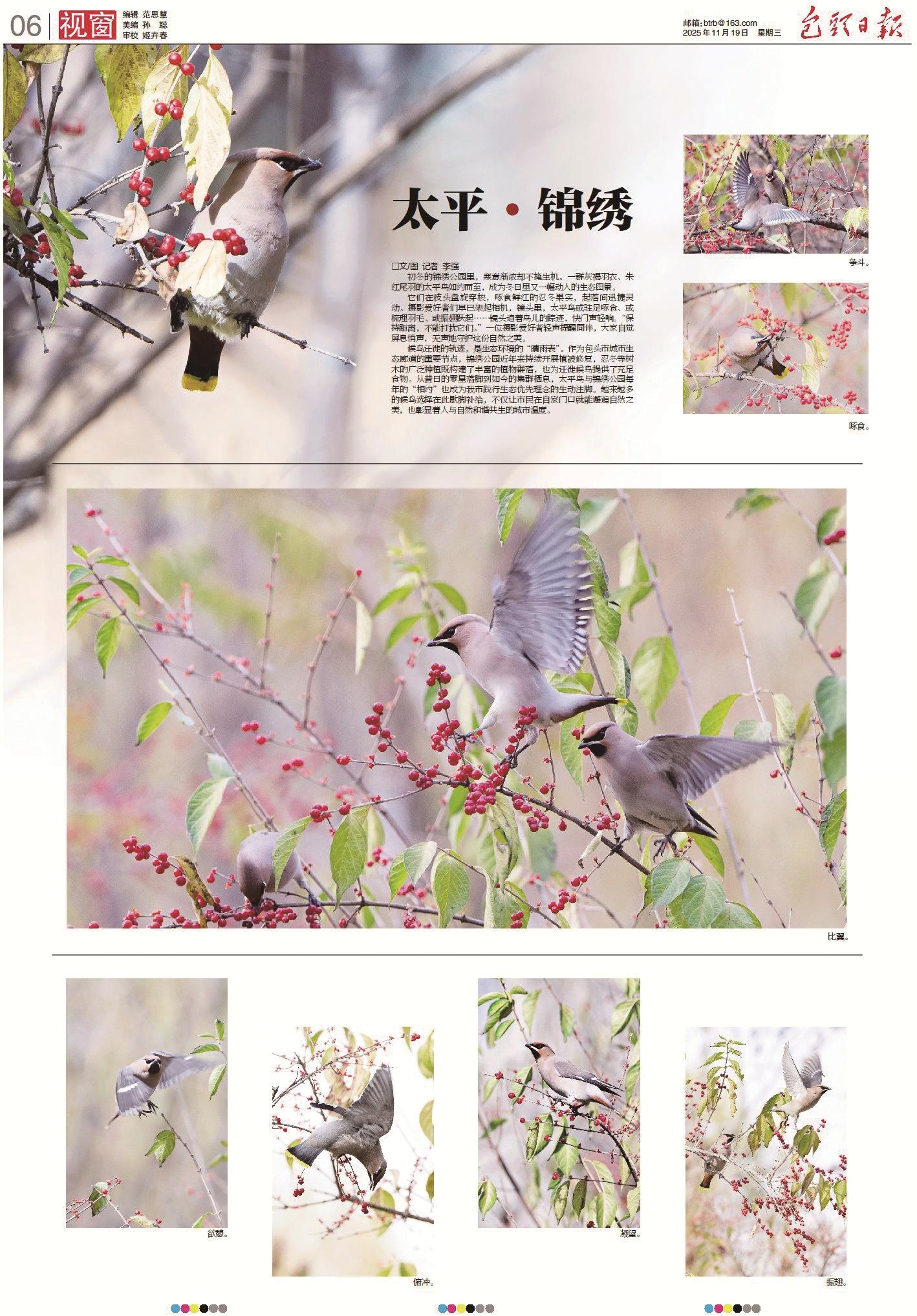 初冬的包头市锦绣公园,寒意渐浓却生机盎然。一群身着灰褐羽衣、缀着朱红尾羽的太平鸟如约而至,这些灵动的候鸟舒展双翼在枝头间穿梭盘旋,鲜红的忍冬果实成为它们迁徙途中的“能量补给站”,啄食时的憨态、翻飞时的矫捷,定格成冬日里最动人的生态图景。