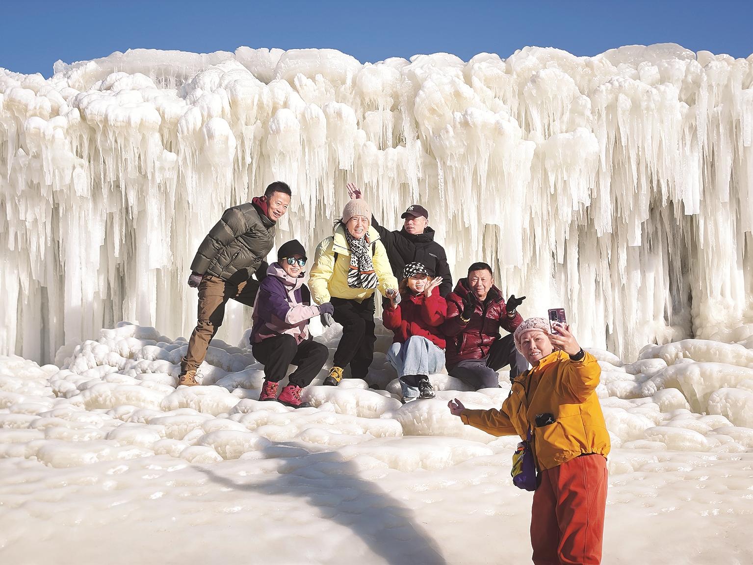刚抵达大罕台,壮观的景象就让人眼前一亮:冰瀑布如银河倒挂,冰柱、冰挂层层朵朵,不少游客举着手机拍照打卡,快门声此起彼伏。冰瀑下方的开阔冰面上,更是一片欢乐海洋——孩子们坐着冰车你追我赶,笑声清脆;成年人也忍不住加入“战局”,重拾童年记忆。
