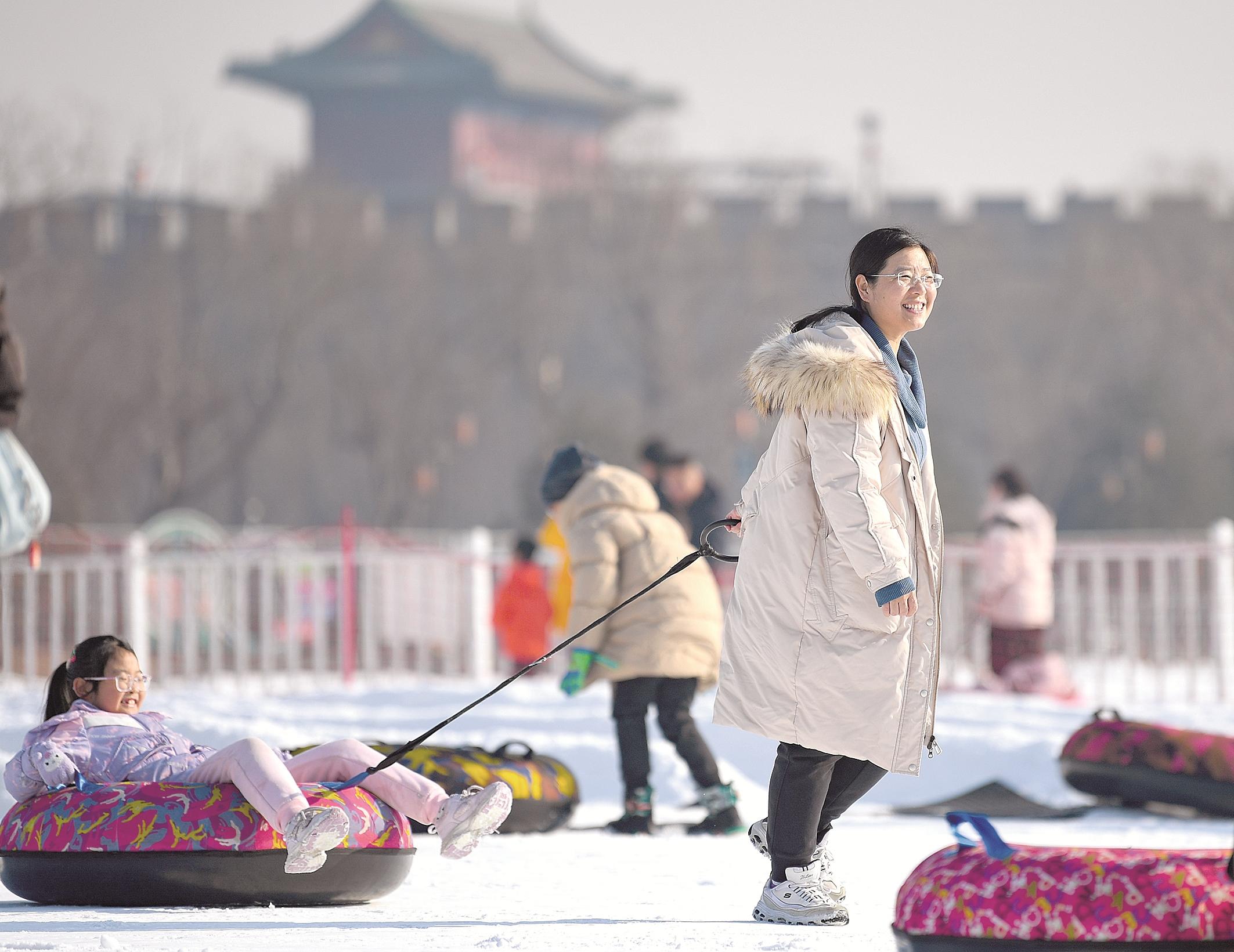 12月28日,小朋友和家长在河北省石家庄市正定县长乐门广场冰雪嘉年华游玩。