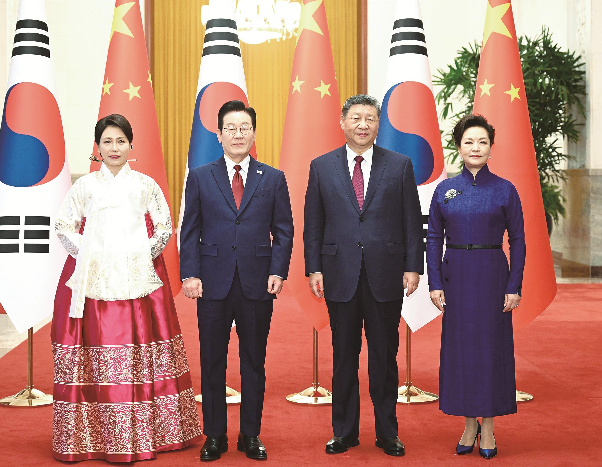 1月5日下午,国家主席习近平在北京人民大会堂同来华进行国事访问的韩国总统李在明举行会谈。这是会谈前,习近平和夫人彭丽媛同李在明和夫人金惠景合影。新华社记者 谢环驰 摄
