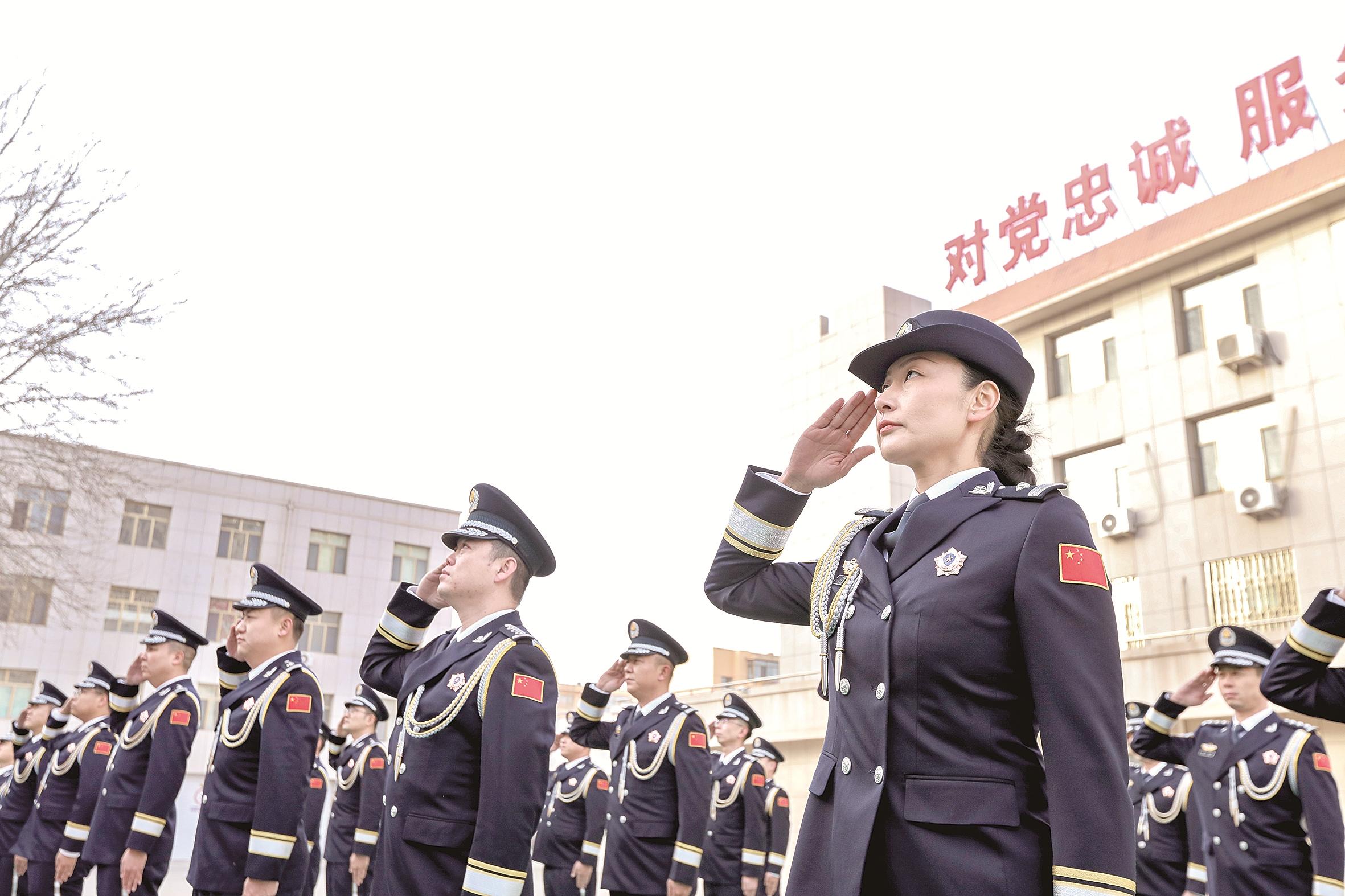 清晨的阳光洒满营区,支队民警身着笔挺警礼服,警容严整、精神抖擞。伴随着激昂的《中国人民警察警歌》,鲜艳的警旗缓缓升起,民警们昂首肃立、庄严敬礼,目光中满是对职业的敬畏与使命的坚守。“我宣誓:坚决拥护中国共产党的绝对领导,矢志献身崇高的人民公安事业……”铿锵有力的宣誓声回荡在营区,将忠诚履职、守护边关的信念深深镌刻在每一位民警心中。