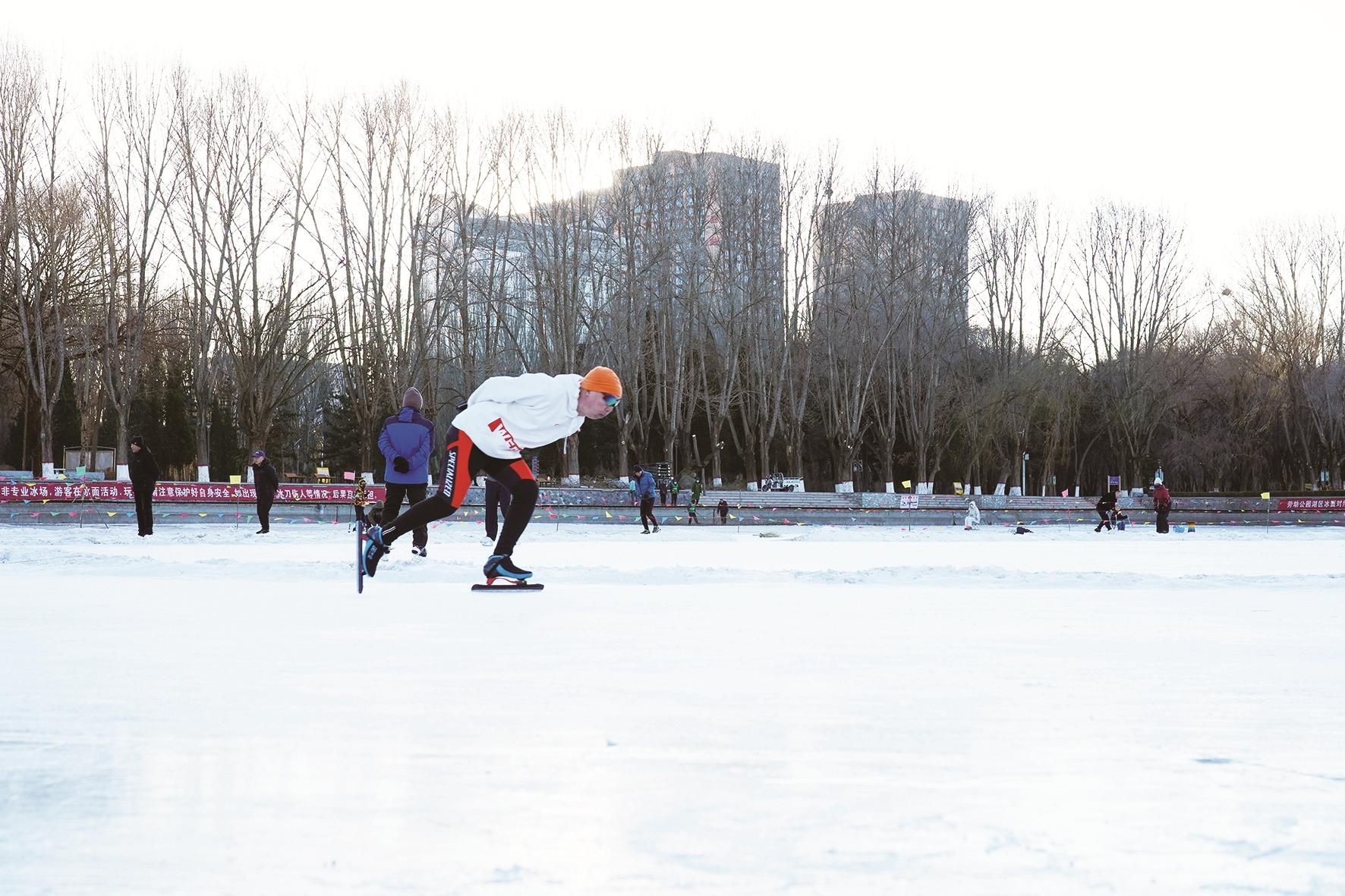 如果说室内冰场是专业与规范的代名词,那室外冰场则凭着独有的野趣与自由氛围成为市民休闲放松的宝藏去处,把冬日的快乐值拉满。在劳动公园的室外冰场,没有年龄的界限,更没有技术的门槛,不同群体都能在这里找到属于自己的冰雪欢愉:资深滑手背着专属冰鞋而来,脚踩冰刃在冰面上灵活穿梭、旋转、跳跃,精湛的技艺引得周围观众阵阵喝彩;初学者则小心翼翼地坐上冰车,双手紧握扶手,在慢慢滑行中感受风儿拂过脸颊的凉意与冰雪的纯净魅力;孩子们更是撒了欢儿,在家长的陪伴下追逐嬉戏,有的推着冰车你追我赶,有的蹲在冰面上玩起冰上陀螺,清脆的笑声像银铃般回荡在冰面之上,感染着在场的每一个人。