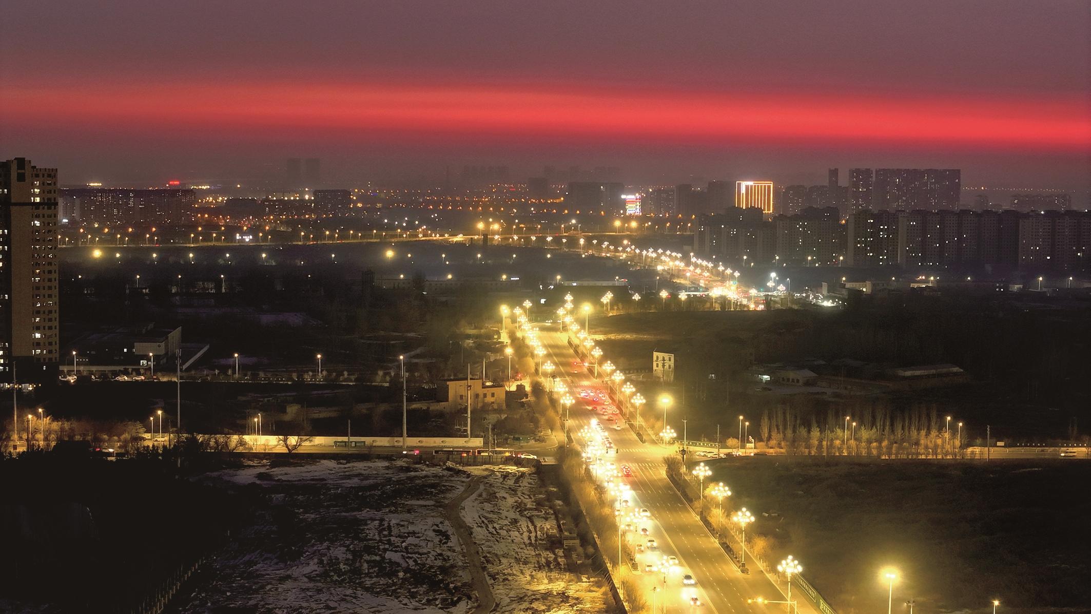 暮色降临,天空被晚霞晕染,红色霞光铺满天际,将城市轮廓勾勒出温柔剪影。随着余晖渐收,城区华灯次第亮起,霓虹与街灯交相辉映,楼宇光影与道路灯带交织成网,尽显鹿城夜晚的繁华与静谧,绘就一幅暮色与夜色相融的城市风光图。