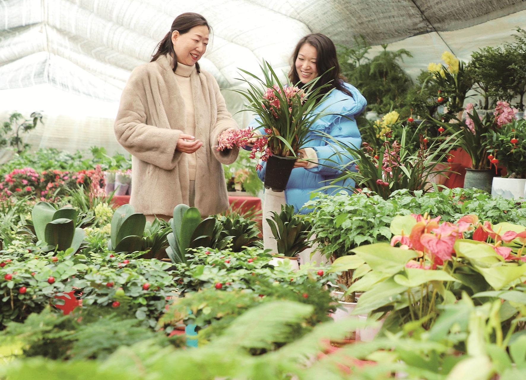 1月5日,在河南省南阳市城乡一体化示范区白河街道一家特色产业种植园,花农在温室大棚里为顾客介绍花卉品种。