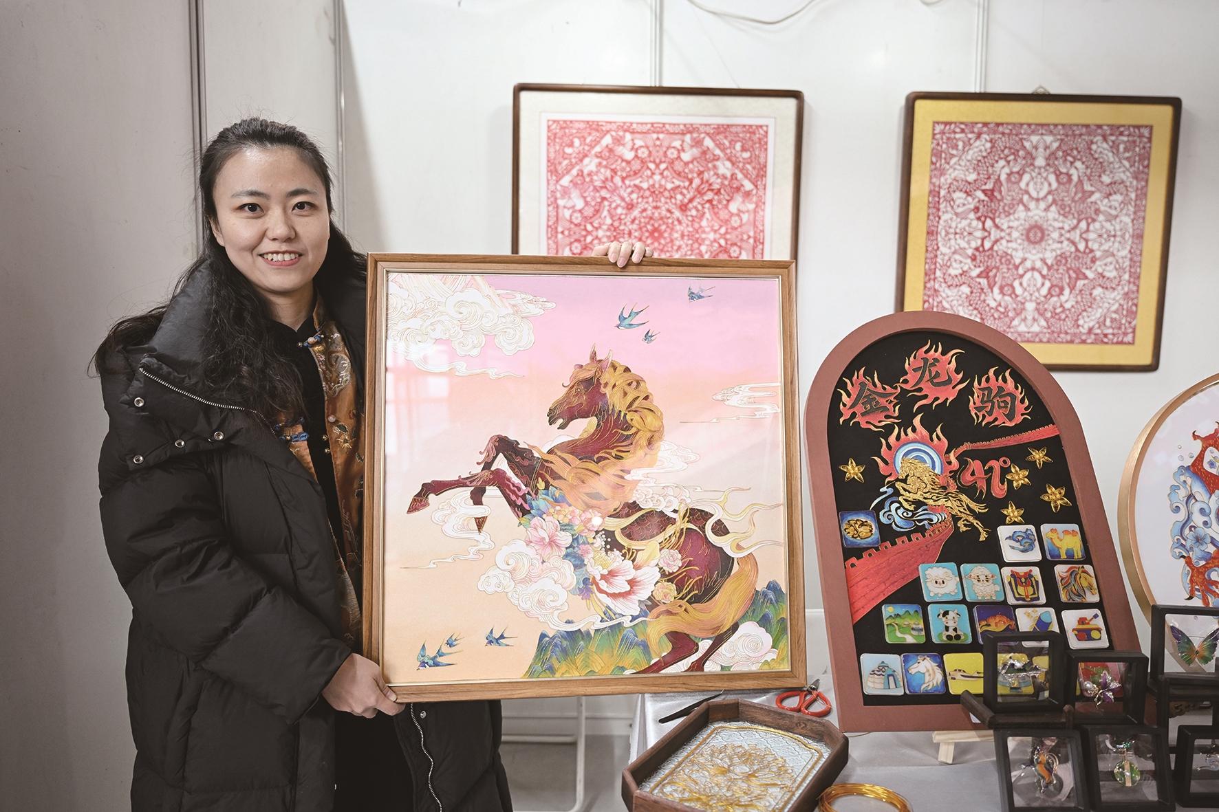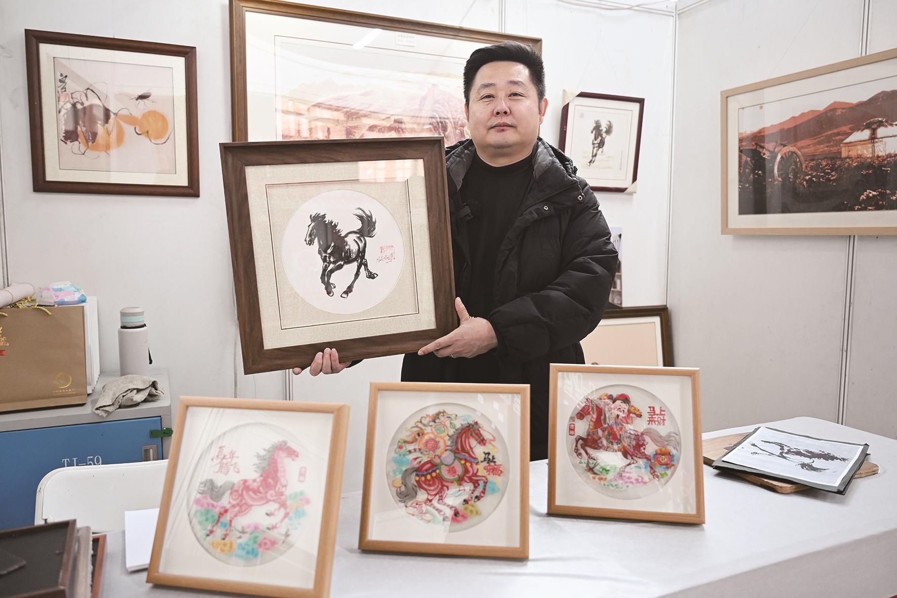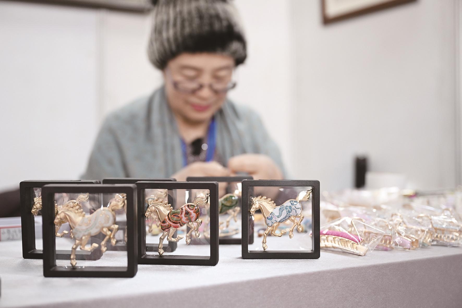 此外,奔马踏祥云的六合枕寓意吉祥顺遂,手工编织的“马上有钱”饱含生活气息,雅致的宋锦、惟妙惟肖的糖画、精美的掐丝珐琅各具韵味,立体感十足的多层剪纸更是令人眼前一亮。“结合马年创作作品,就是想让更多人爱上非遗。”市级非遗多层剪纸传承人刘俊杰一语道出匠心。