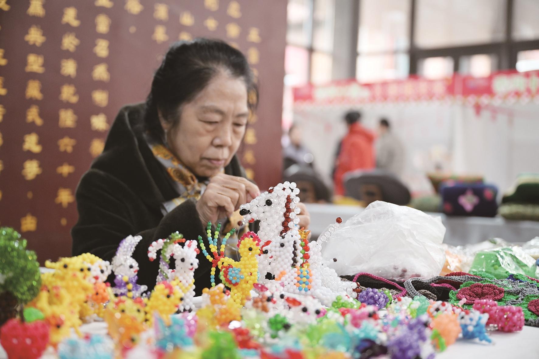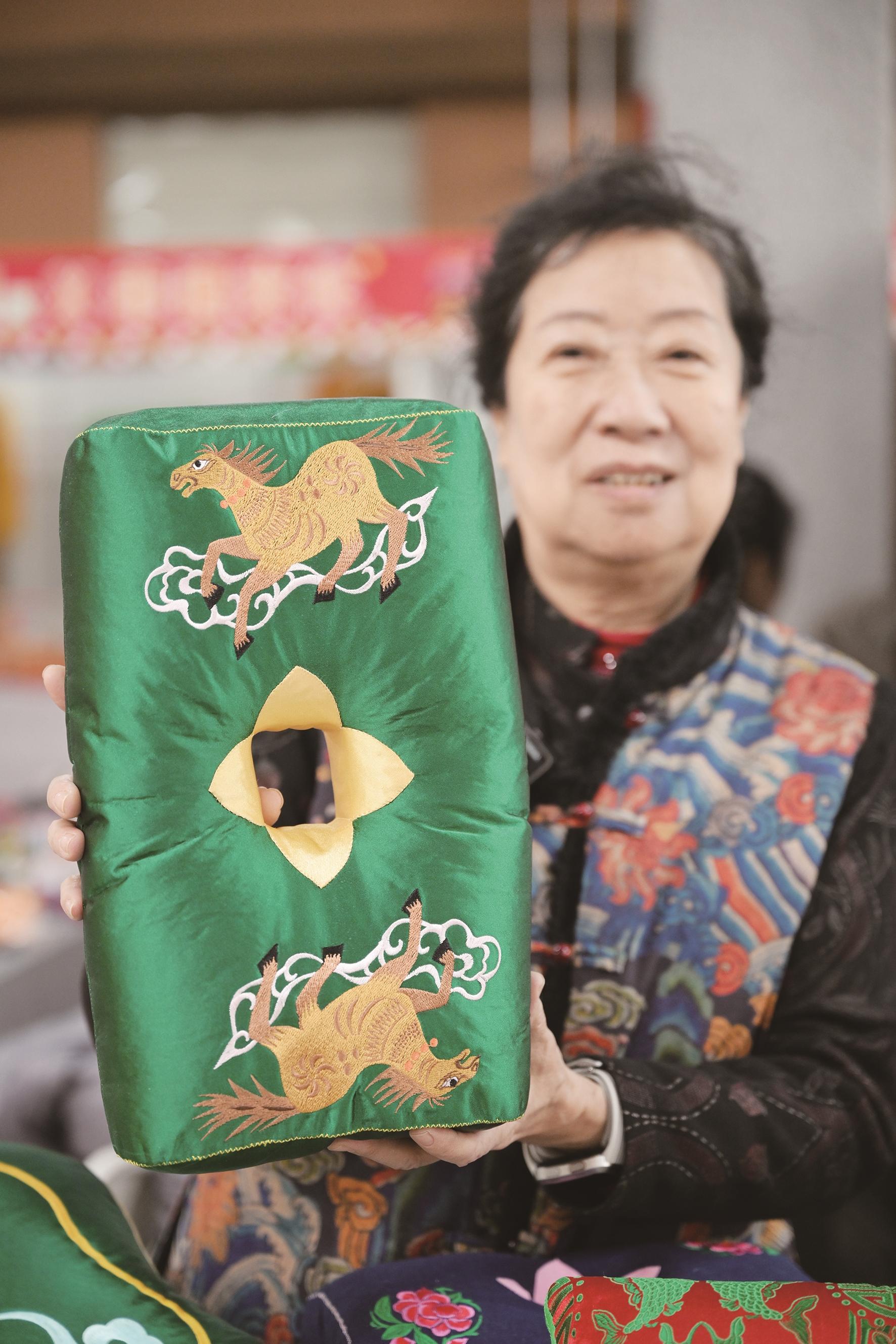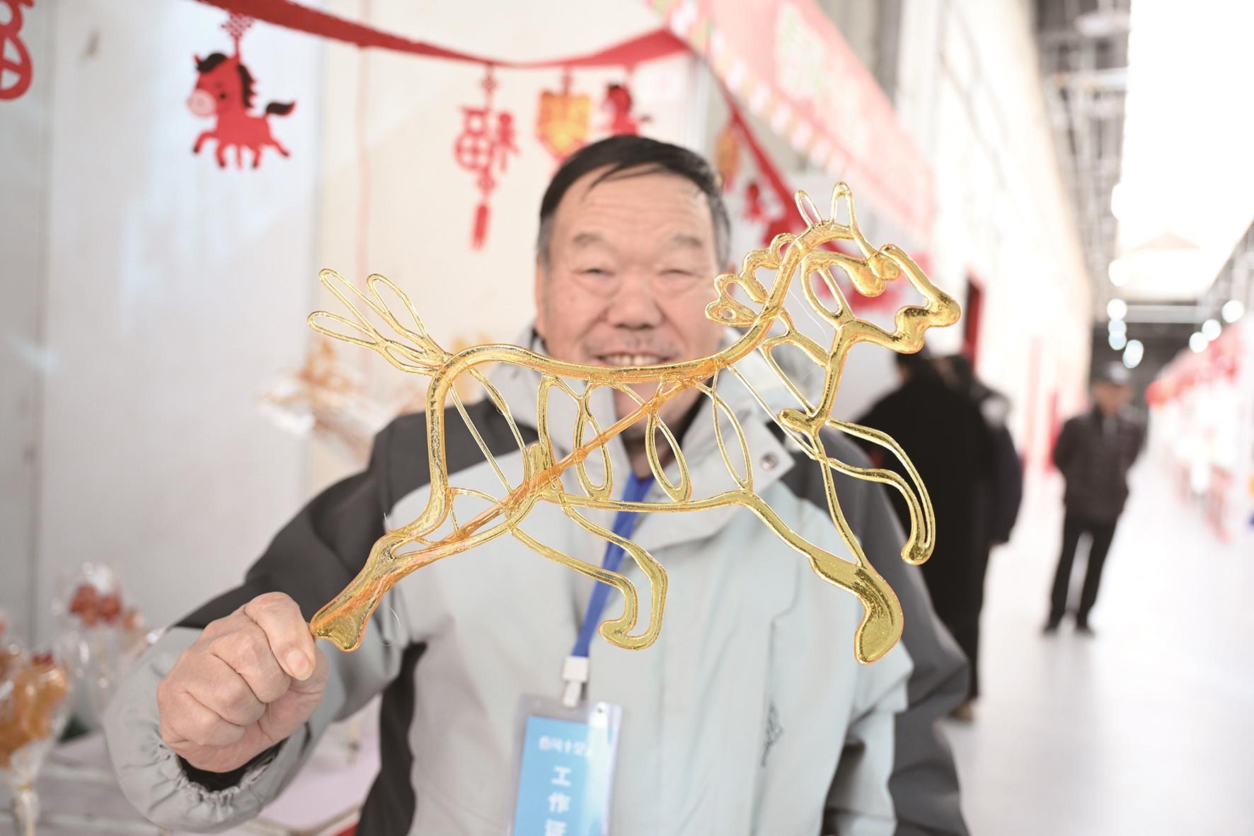 此外,奔马踏祥云的六合枕寓意吉祥顺遂,手工编织的“马上有钱”饱含生活气息,雅致的宋锦、惟妙惟肖的糖画、精美的掐丝珐琅各具韵味,立体感十足的多层剪纸更是令人眼前一亮。“结合马年创作作品,就是想让更多人爱上非遗。”市级非遗多层剪纸传承人刘俊杰一语道出匠心。
