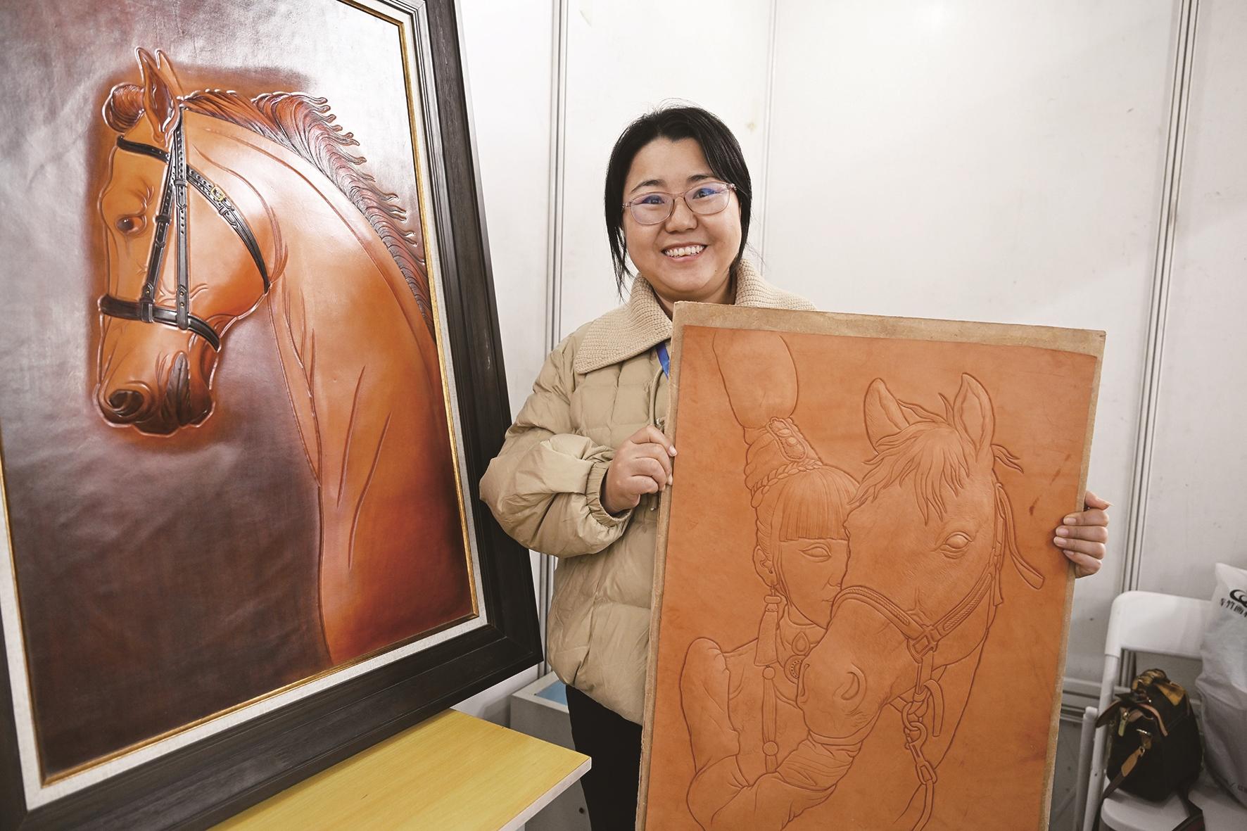澄净的玻璃瓶内壁上,一幅《奔马图》栩栩如生。包头市级非遗内画代表性传承人张俊珍在方寸内勾勒出骏马奔腾之姿,“马到成功”的美好祝愿跃然瓶中。卡通感十足的葫芦刺刻作品童趣盎然,憨态可掬的骏马图案跃动葫芦之上,传统刺刻技艺与现代审美碰撞出奇妙的火花。硬核皮雕作品质感十足,骏马的鬃毛、肌肉纹理清晰可见,一刀一凿间,尽显皮雕技艺的粗粝与精致。
