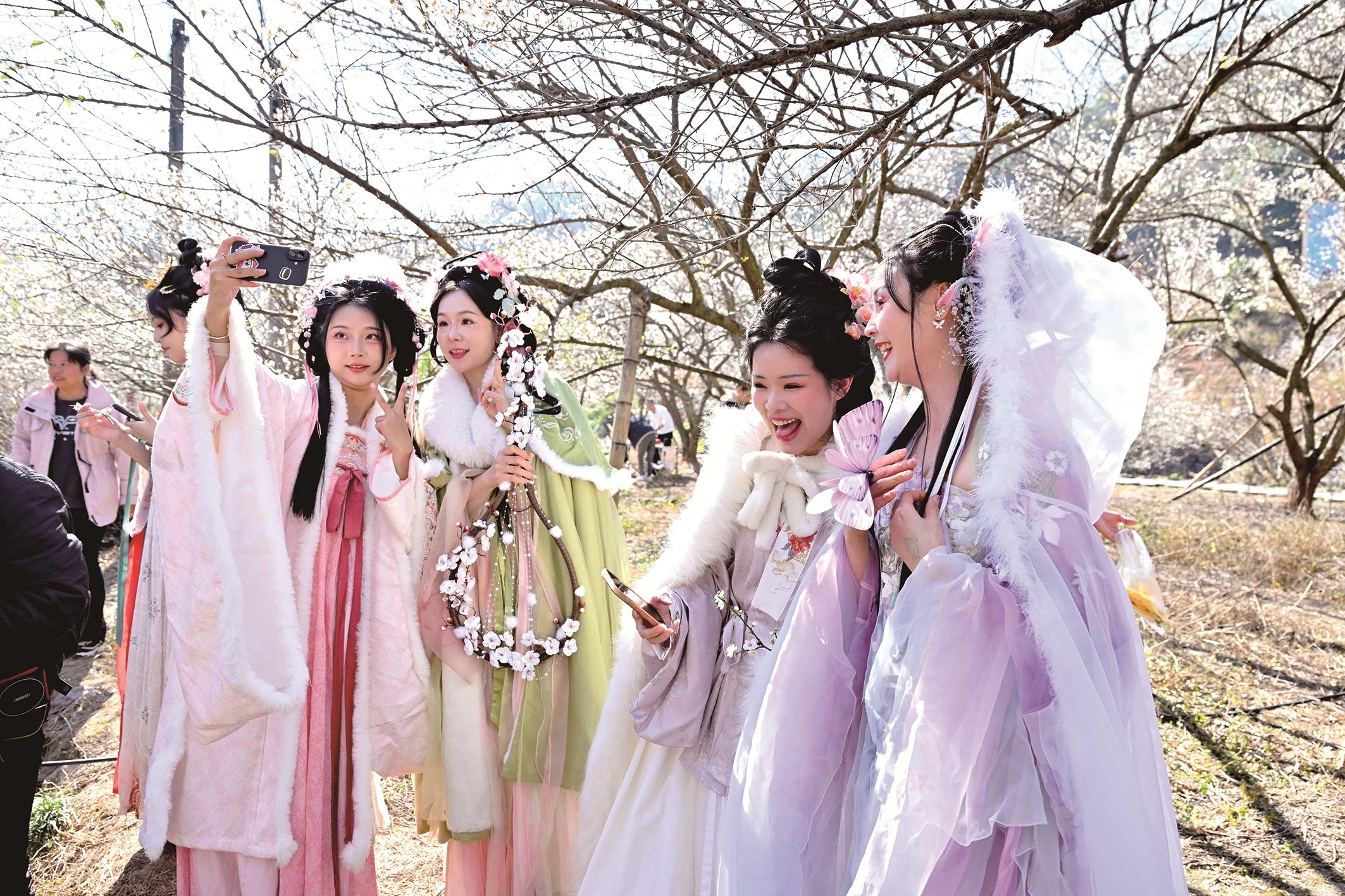 时值青梅绽放时节,1月10日,福建省福州市永泰县一年一度的梅花季系列活动在葛岭镇溪洋村文埕湾拉开帷幕,吸引众多游客前来打卡游玩。