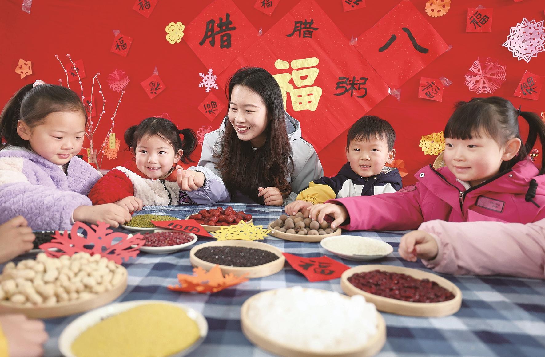 1月26日,在山东省临沂市沂南县湖头镇中心幼儿园,老师教小朋友认识制作腊八粥的食材。
