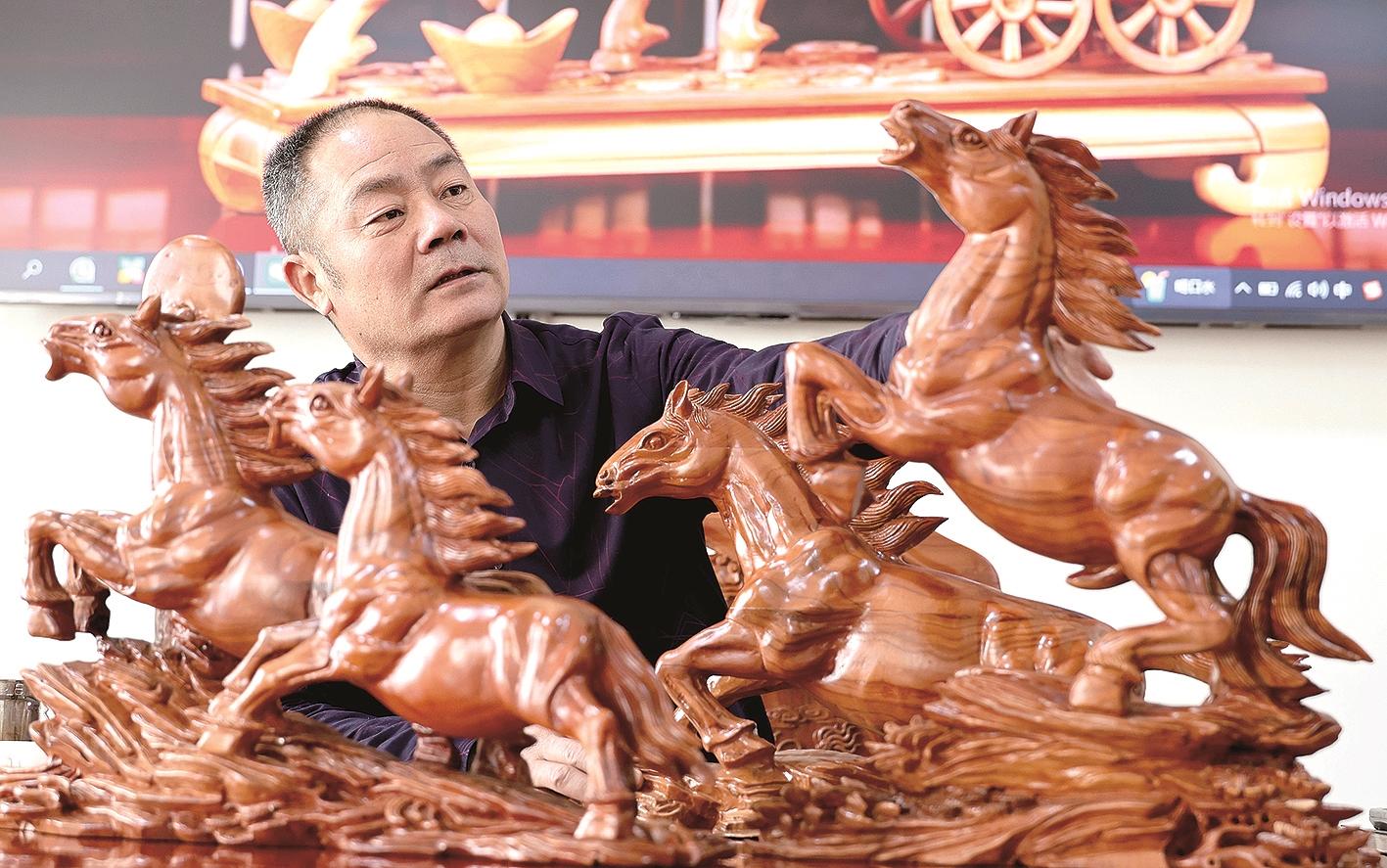1月15日,在山东省临沂市蒙阴县桃墟镇,市级非物质文化遗产代表性传承人石绍松在雕琢马年主题文创作品。
