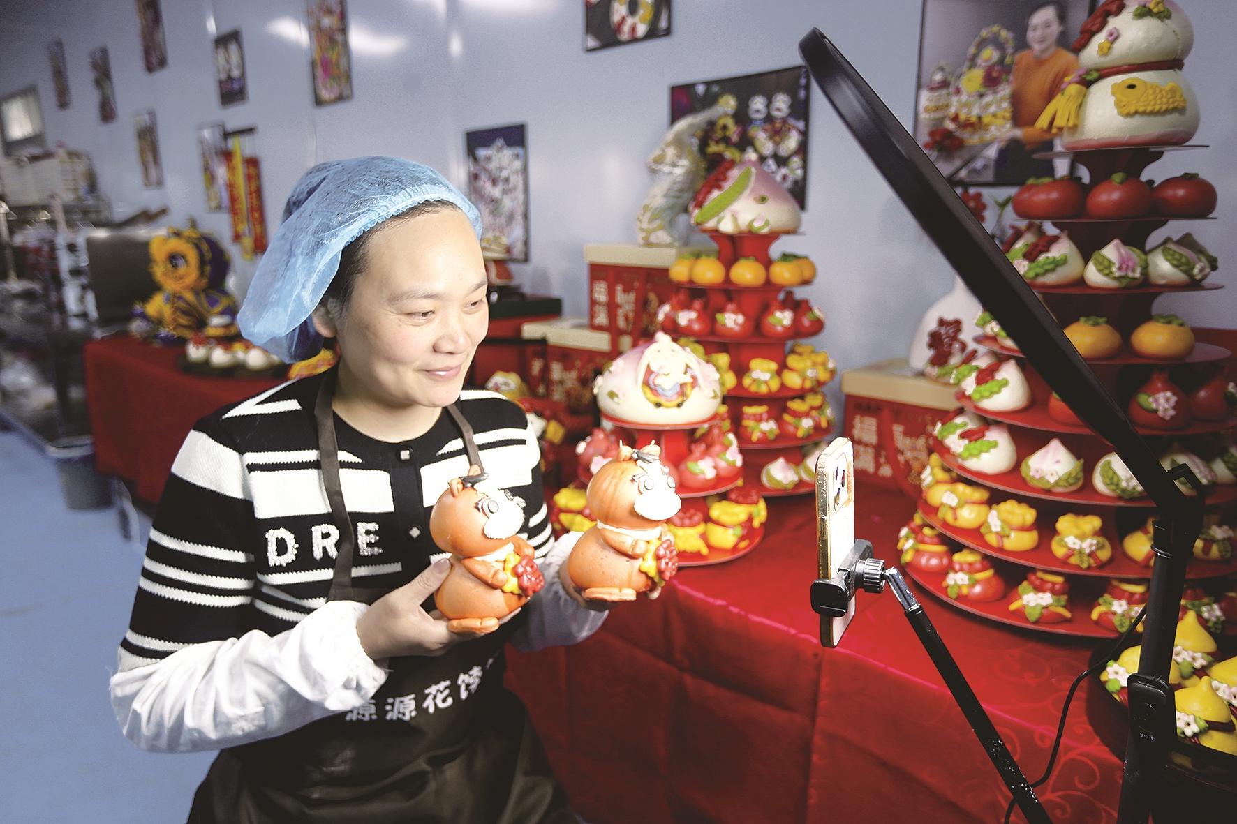1月28日,江苏省连云港市一家花饽饽工作坊的员工在网上直播销售新春花馍。