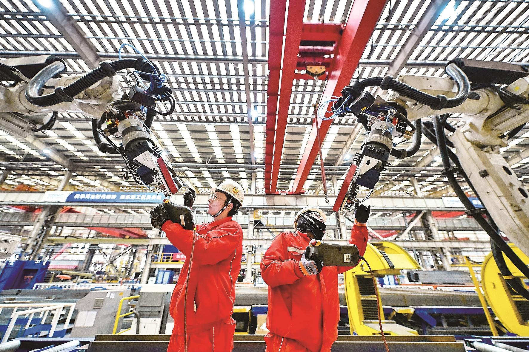 1月29日,在天津市滨海新区,海上油气平台建设工人操作打磨机器人。