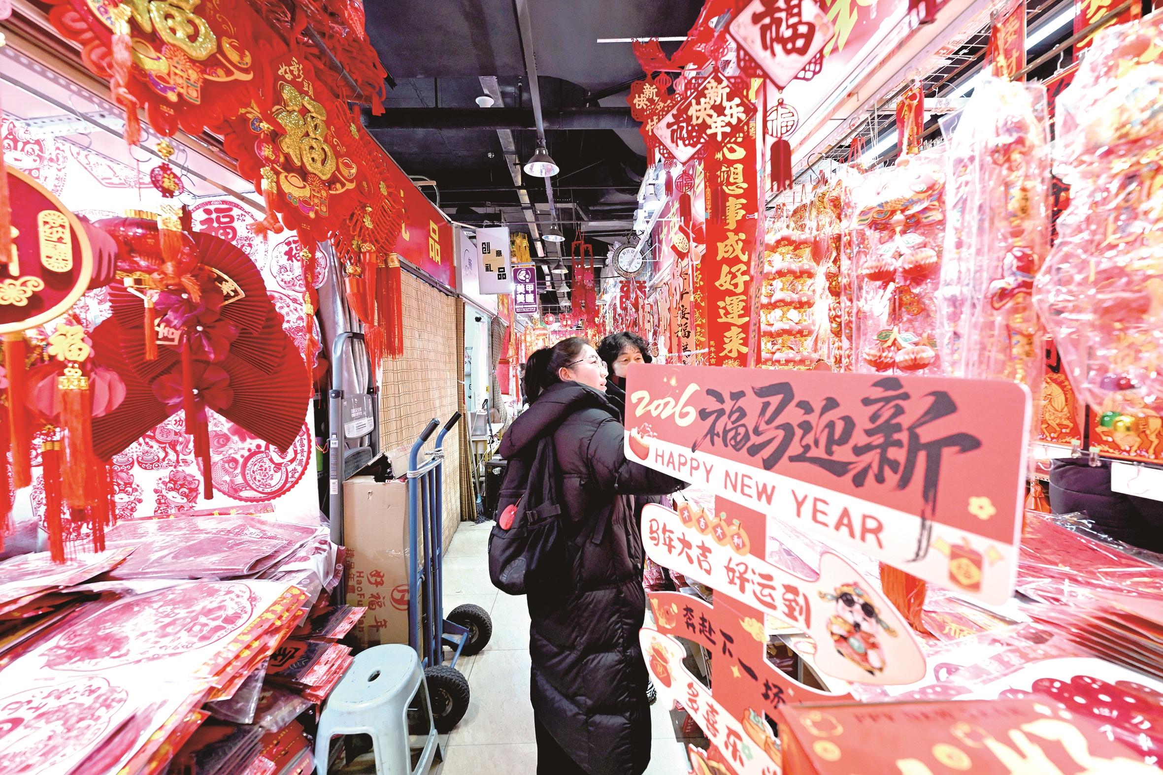 1月28日,我市106小商品批发市场内一派热闹景象,红彤彤的马年春联、喜庆的红灯笼、各式祥马迎春饰品琳琅满目,吸引众多市民前来挑选置办。大家穿梭于摊位之间,精心选购年货,在浓浓的烟火气中迎接马年新春。