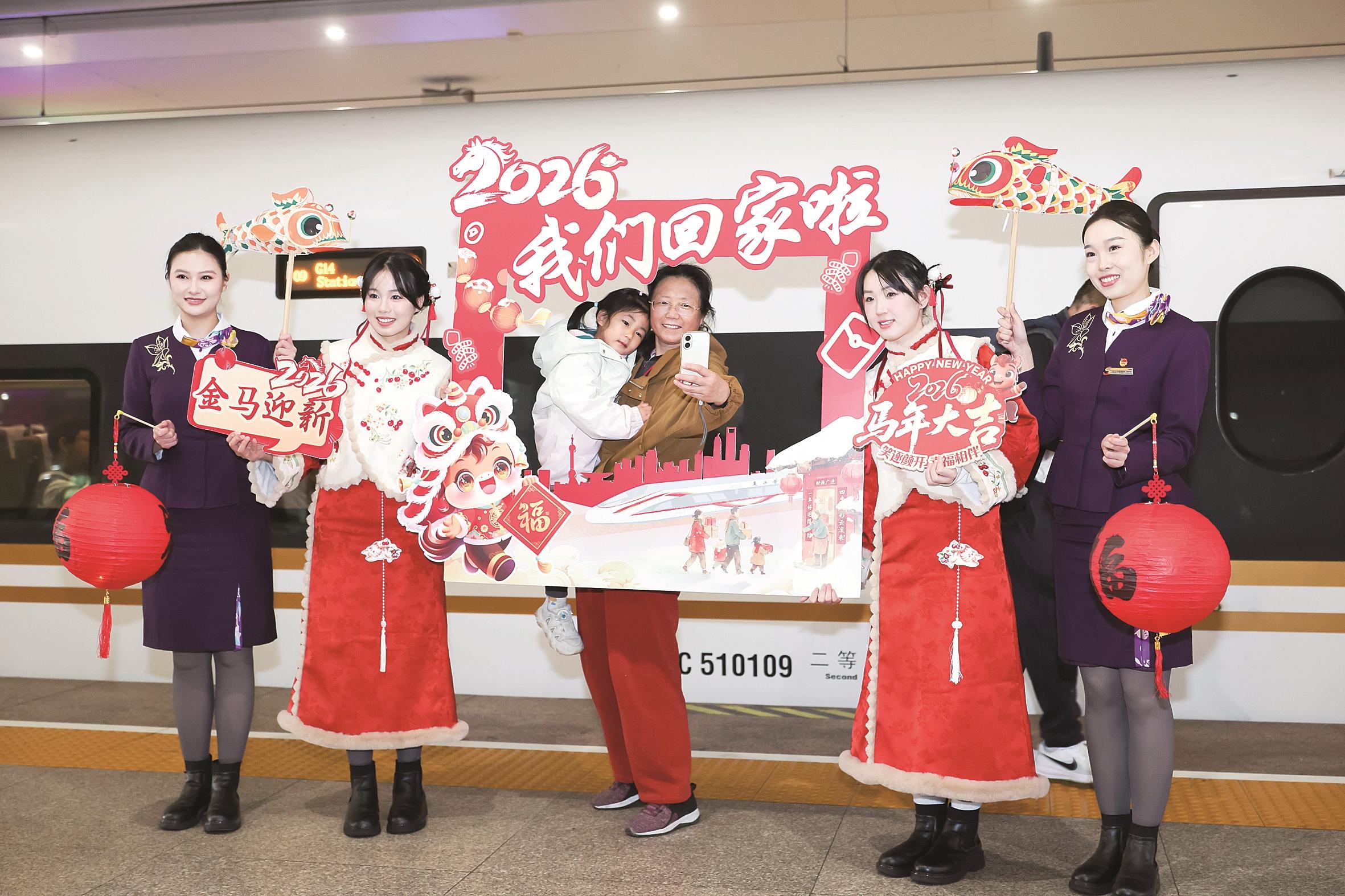 2月2日,在上海虹桥火车站,旅客和铁路上海客运段乘务员在G14列车外打卡合影。