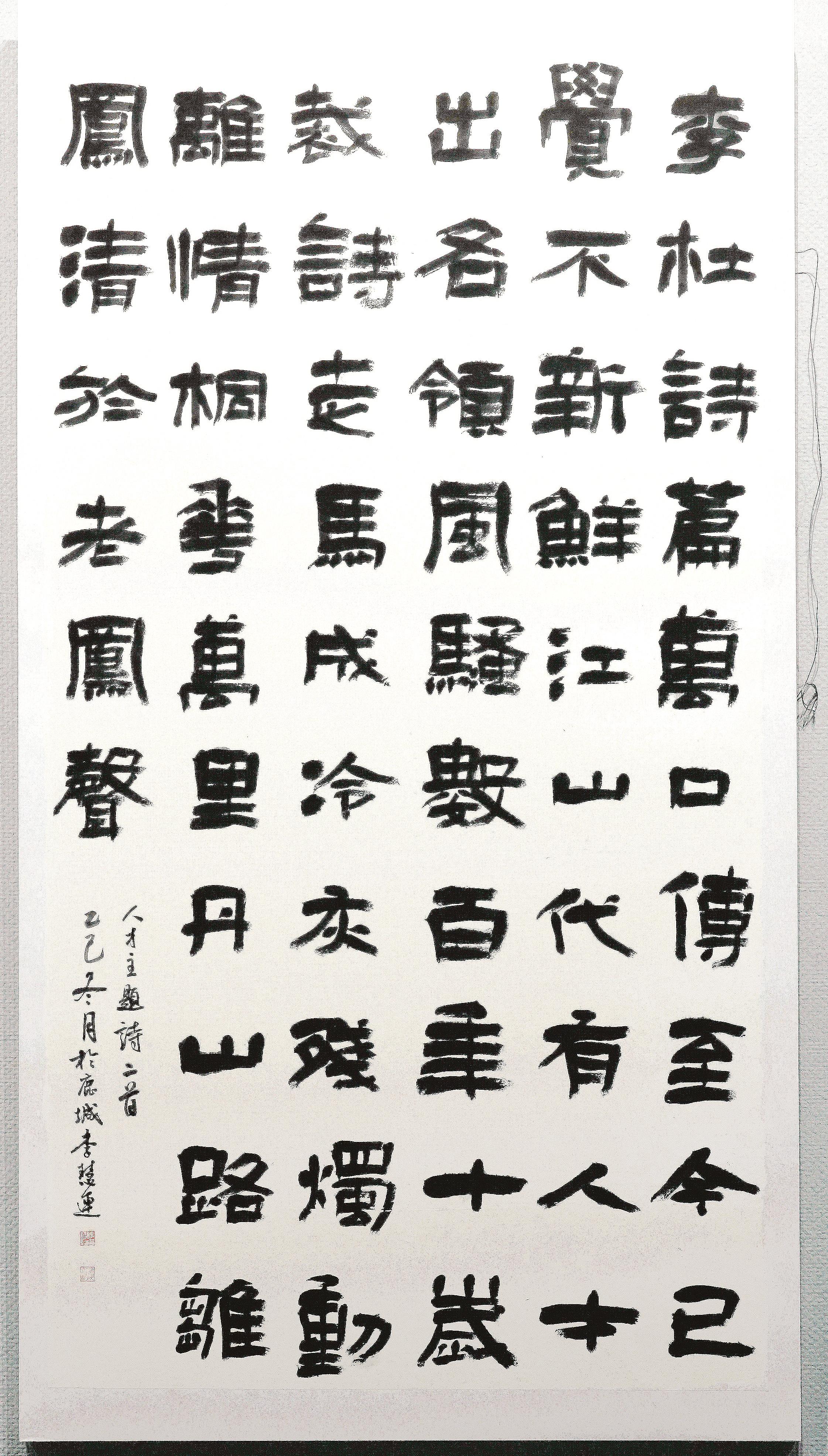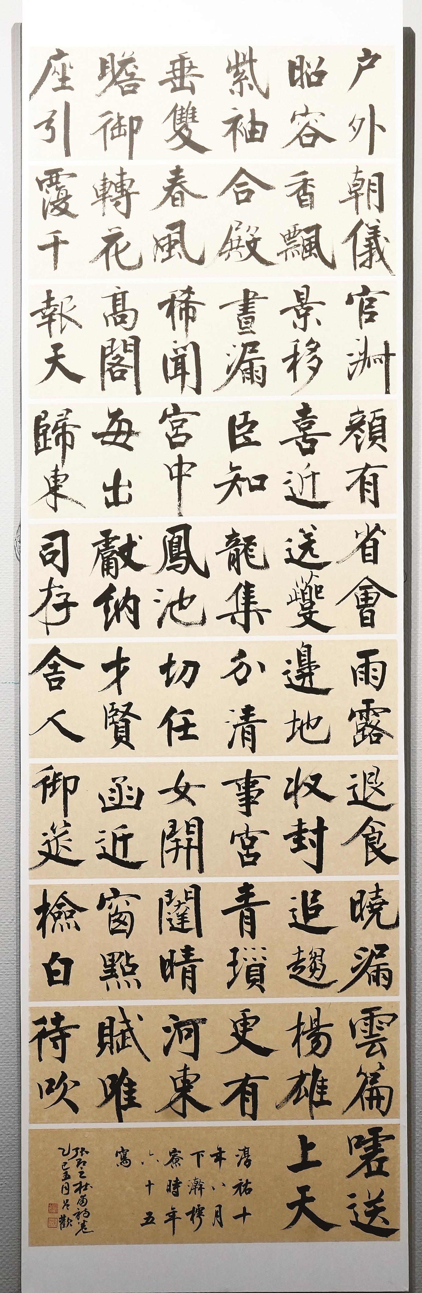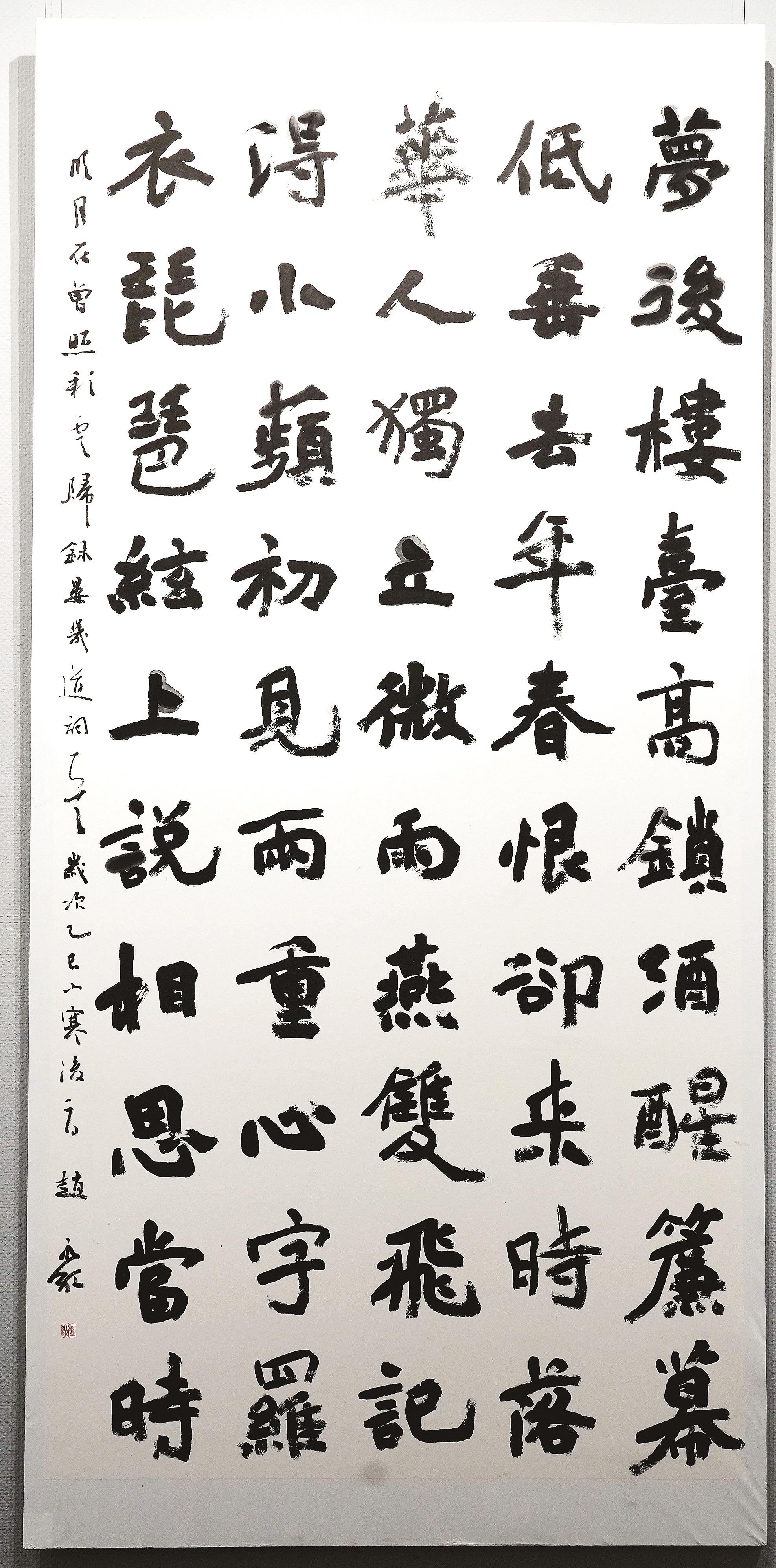 李慧连的参展作品以隶书和楷书为主,风格偏向平静文气。“我写的是大字,但追求的是静气。”李慧连介绍,作为书法创作者,她始终保持严谨态度,每一幅展出的作品都是反复推敲后的心血之作。