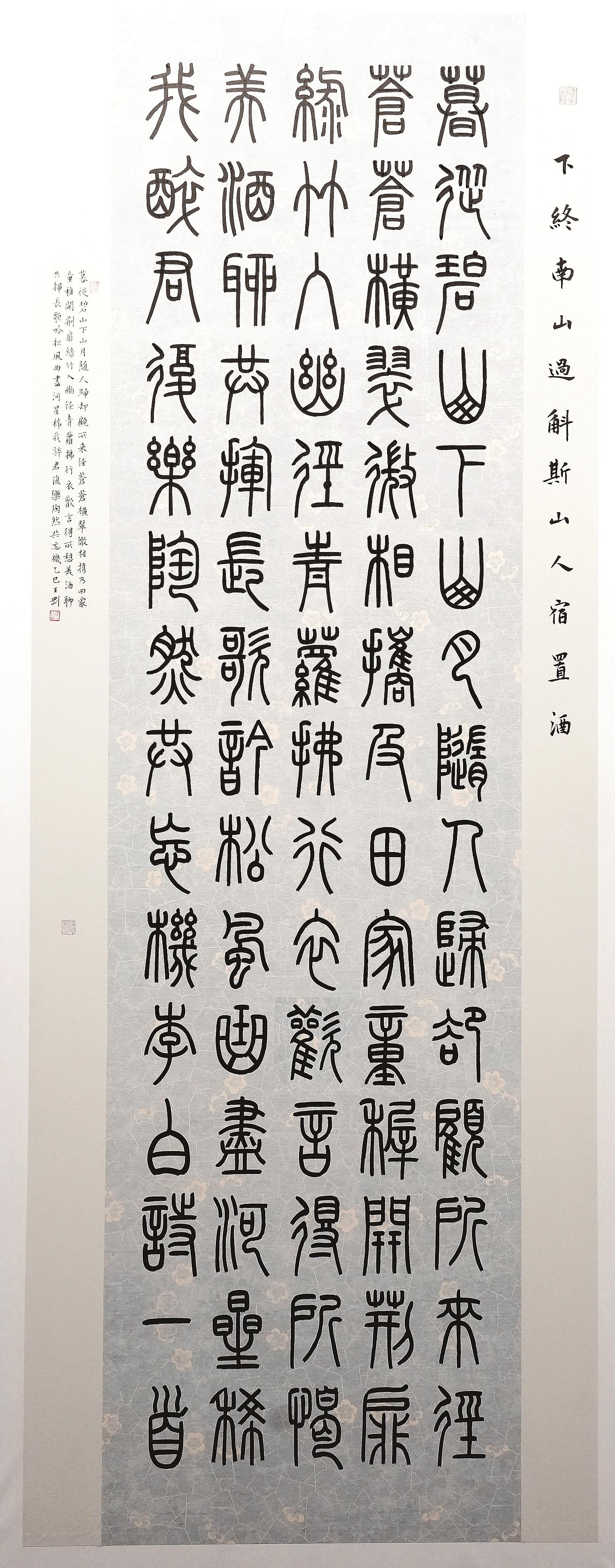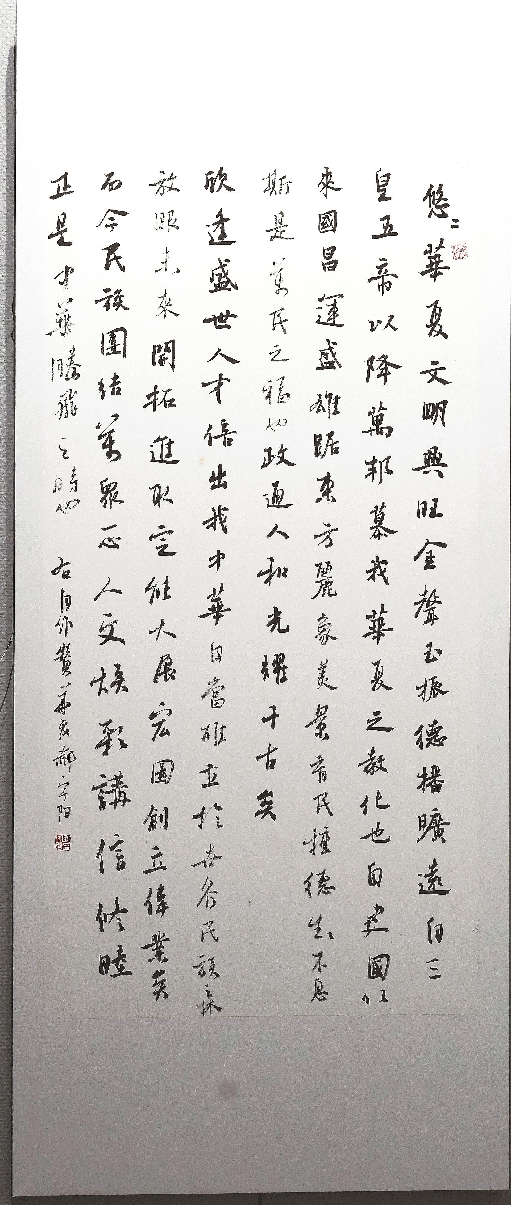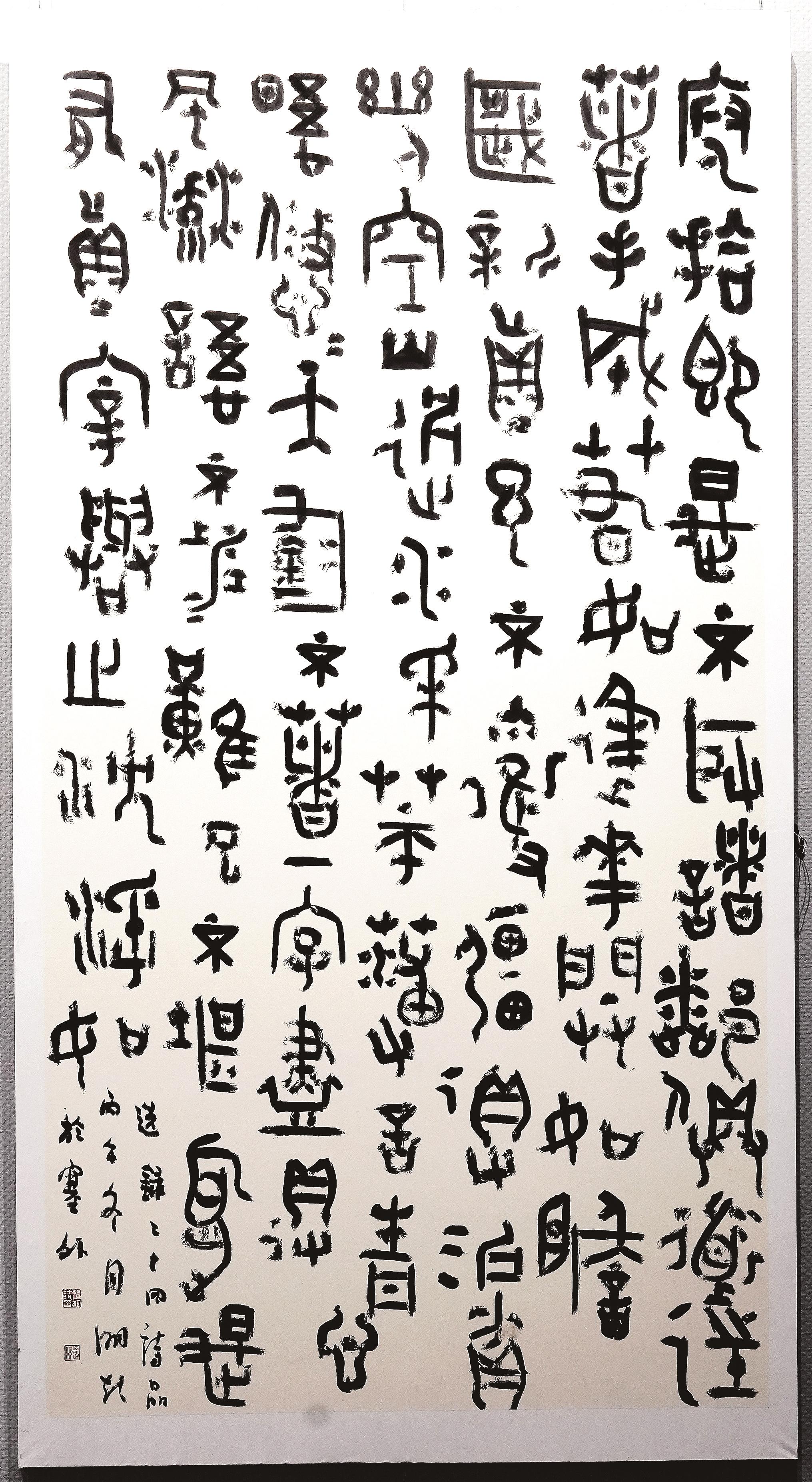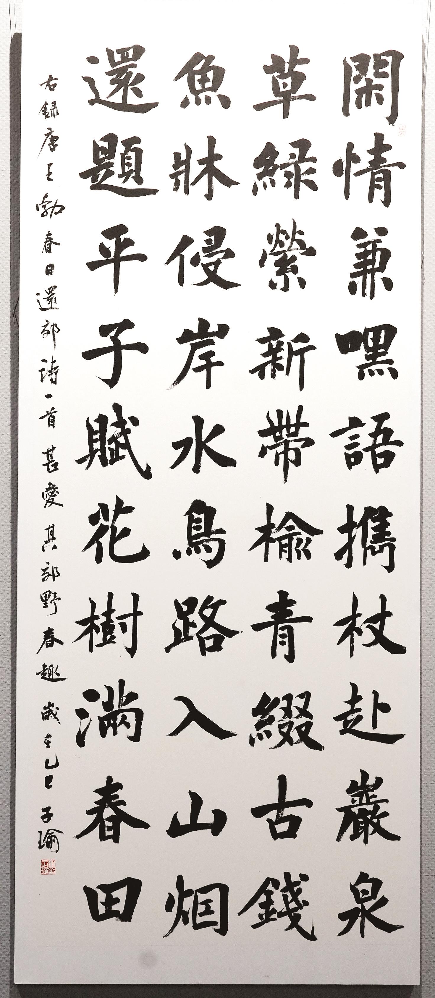 李慧连的参展作品以隶书和楷书为主,风格偏向平静文气。“我写的是大字,但追求的是静气。”李慧连介绍,作为书法创作者,她始终保持严谨态度,每一幅展出的作品都是反复推敲后的心血之作。