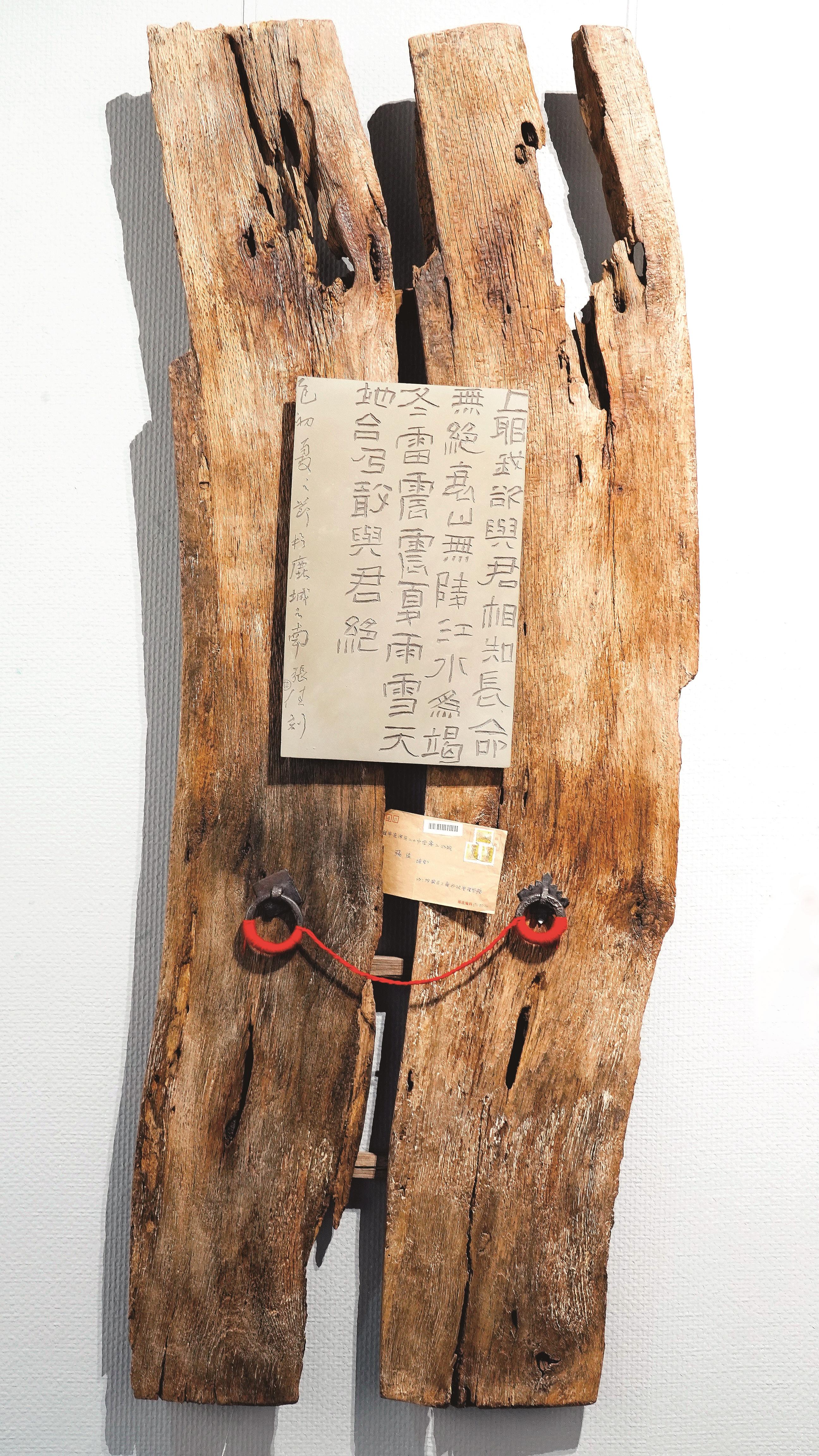 包头市书协副主席张佳此次参展的作品包含书法、篆刻、陶板等,其中一件以旧门板为载体的陶板篆刻作品格外引人关注。作品内容源自一封中学情书,铜环系着红线,贴着泛黄信封,饱含着生活温度与情感故事。“艺术作品就是要抒发自己的真情实感,这样才能打动人心。”张佳说。
