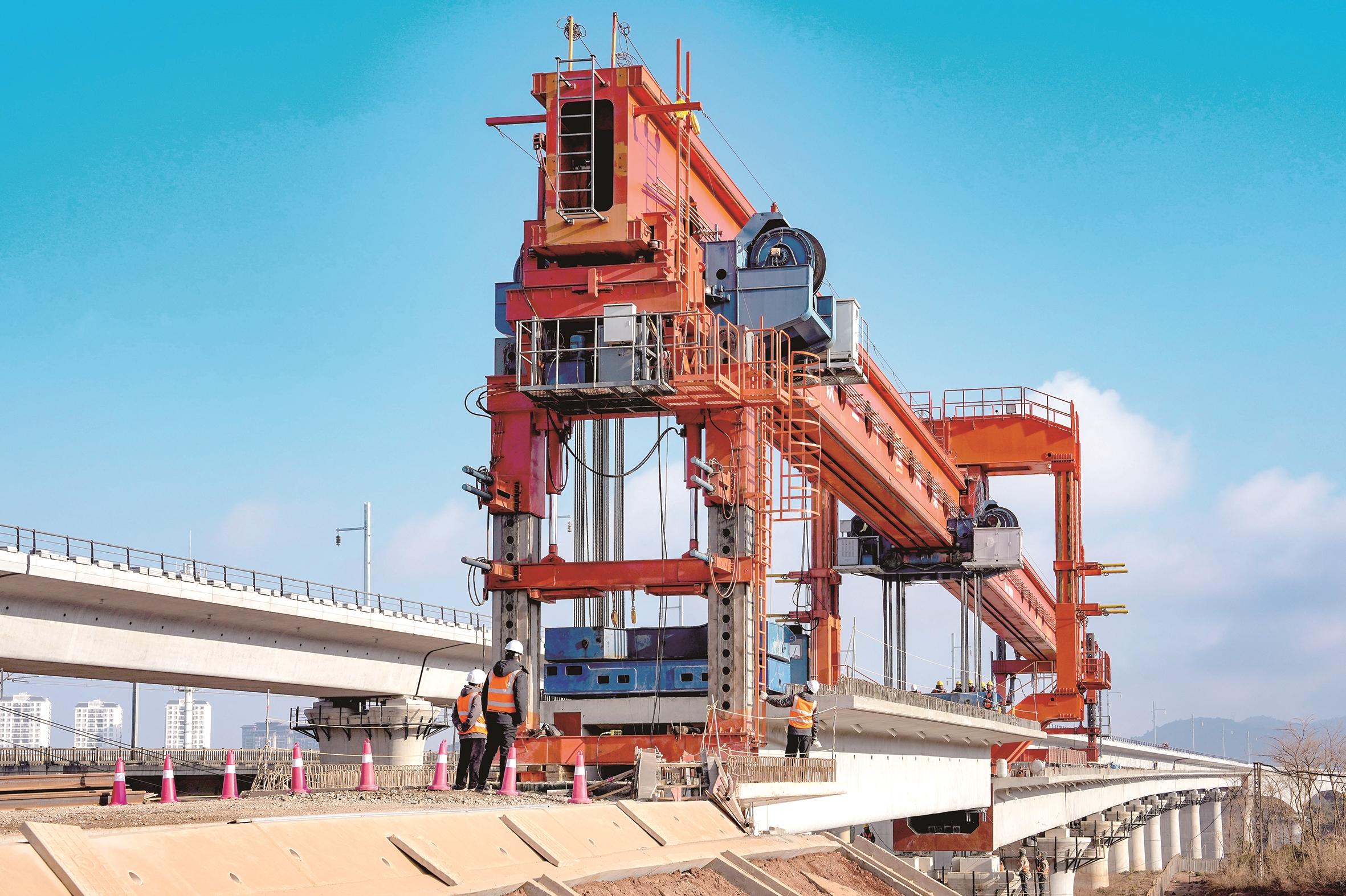 2月3日上午,在位于云南省昆明市呈贡区的渝昆高铁施工现场,随着最后一榀箱梁精准落位,渝昆高铁全线桥梁建设全部完成,为后续铺轨及站后工程施工奠定了坚实基础,标志着渝昆高铁建设进入全面冲刺阶段。新华社记者 陈欣波 摄