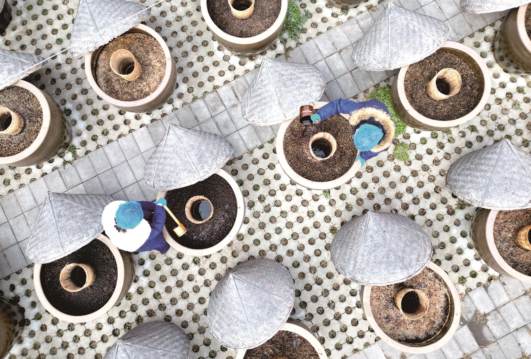 新春临近,在山东省滕州市的传统酱油酿造基地,数百口酱缸在冬日暖阳下整齐列阵。经过日晒夜露的酿造,浓郁酱香裹挟着麦香与豆香在晒场弥漫,交织成独特的年味。这些承载着传统年味的酱油将装车发往各地,为千家万户的年夜饭增添醇厚滋味。 新华社发(李志军 摄)