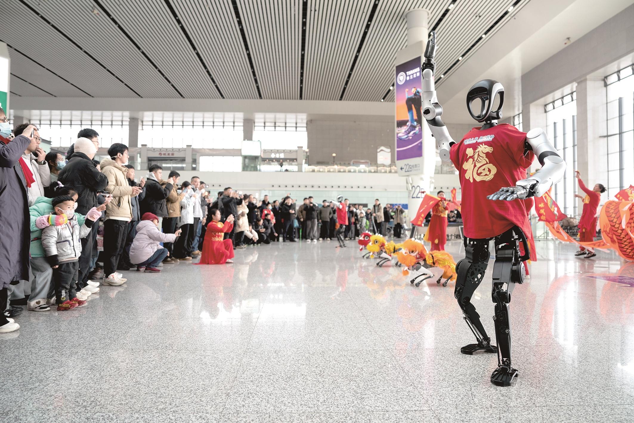 2月2日,乘客在合肥南站观看机器人拜年表演。 新华社记者 杜宇 摄