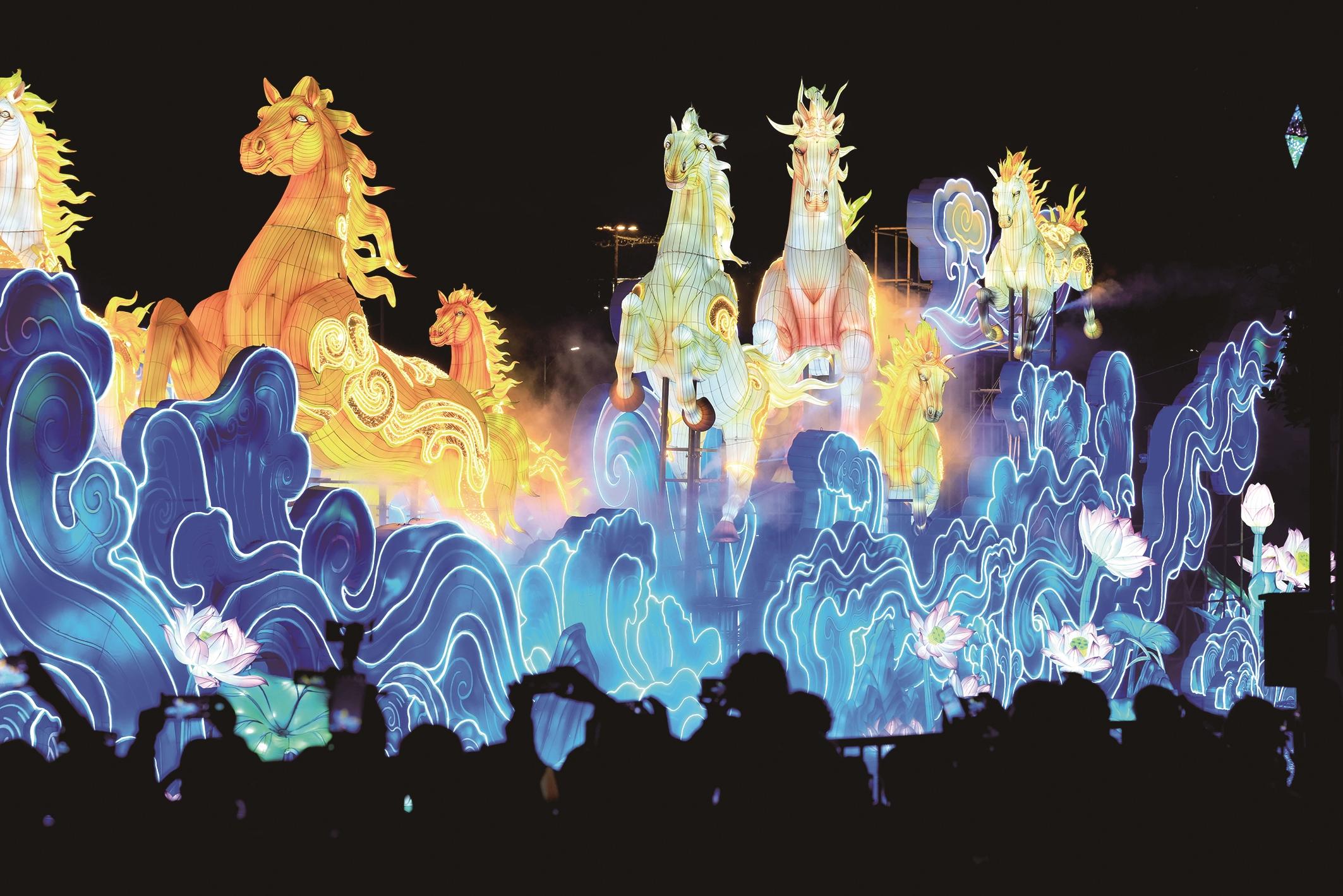 1月30日,“粤韵千年·四海同心”2026广州新春灯会在广州市越秀公园开幕,上万盏氛围彩灯交相辉映、熠熠生辉。 图为“万马奔腾”灯组。 新华社记者 王瑞平 摄