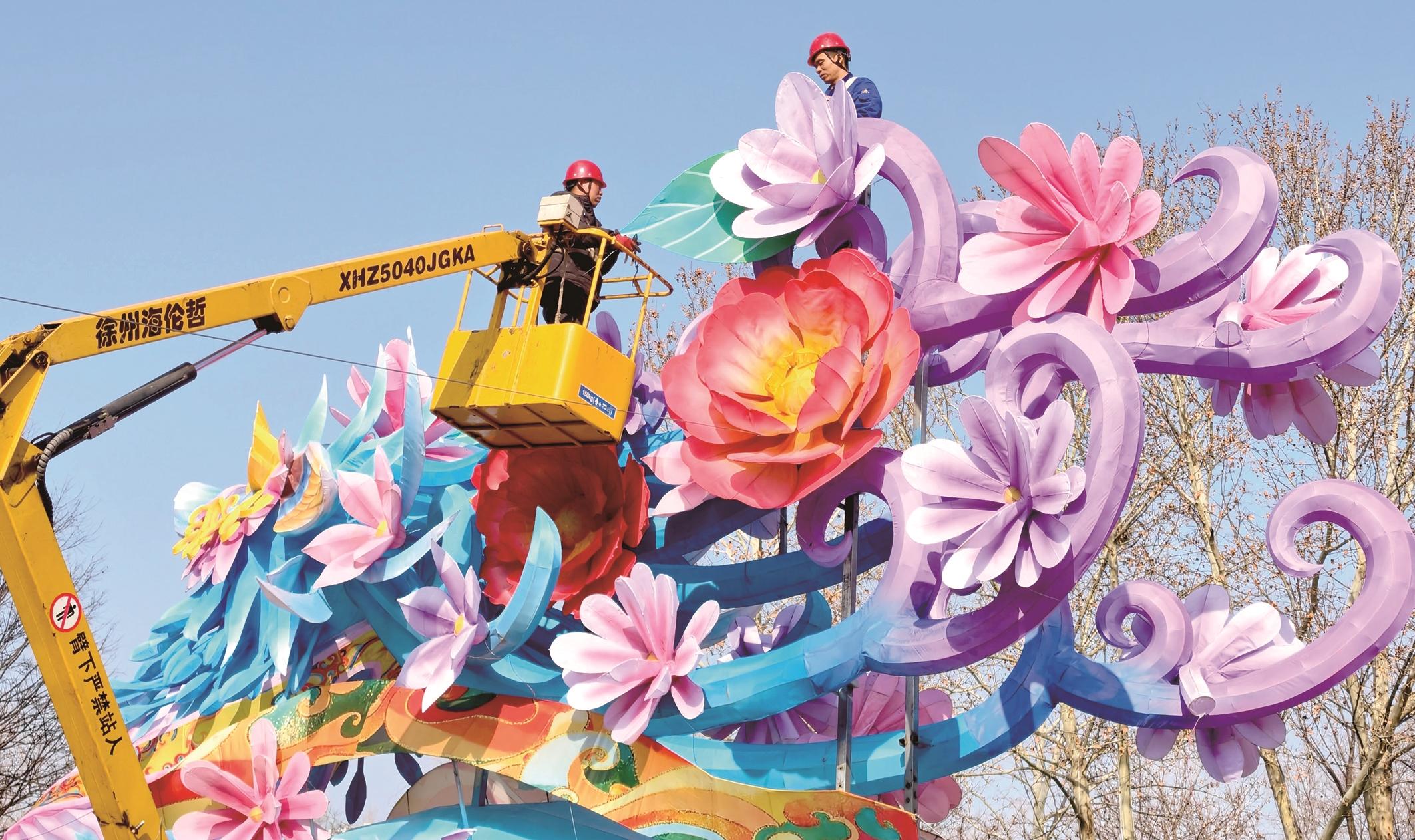 农历马年春节临近,各地张灯结彩。图为2月2日,在洛阳隋唐遗址植物园,工作人员在安装花灯。 新华社发(高山岳 摄)