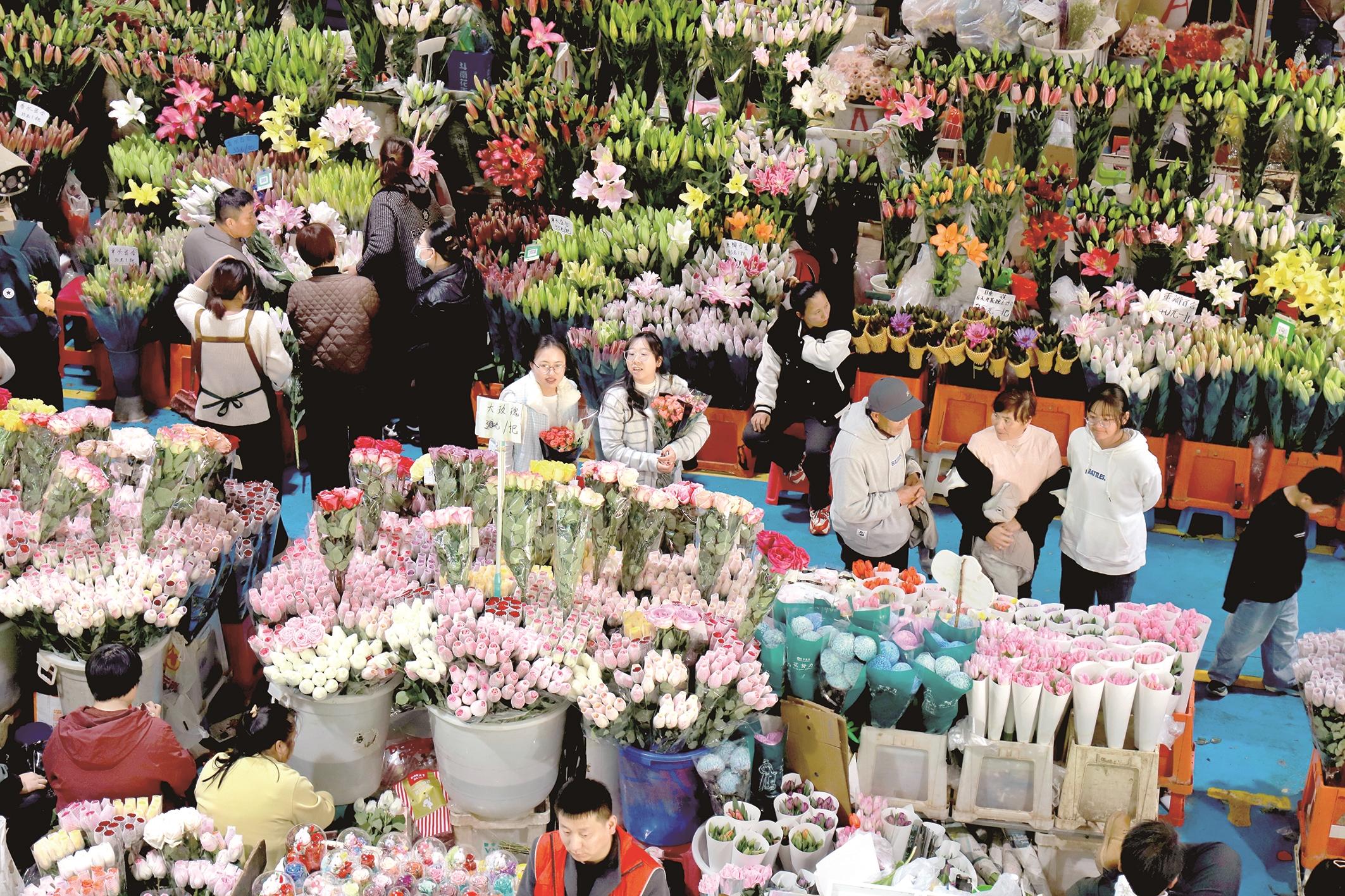 春节将至,云南省昆明市斗南花卉市场人头攒动,人们选购年宵花、鲜切花等,各类花卉销售持续走俏。 新华社发(郑益 摄)