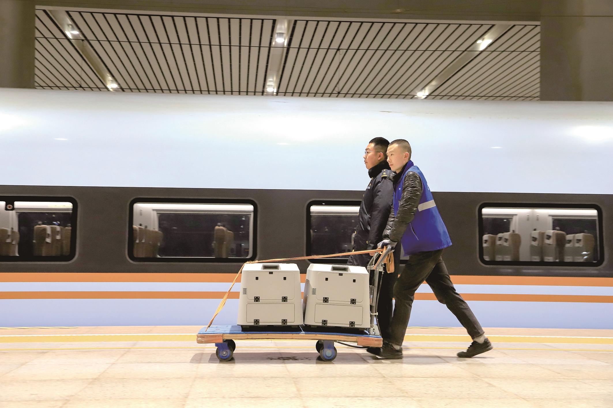 → 2月1日,中铁快运兰州西站营业部工作人员准备将旅客托运的宠物送上高铁列车。 新华社发(王光辉 摄)